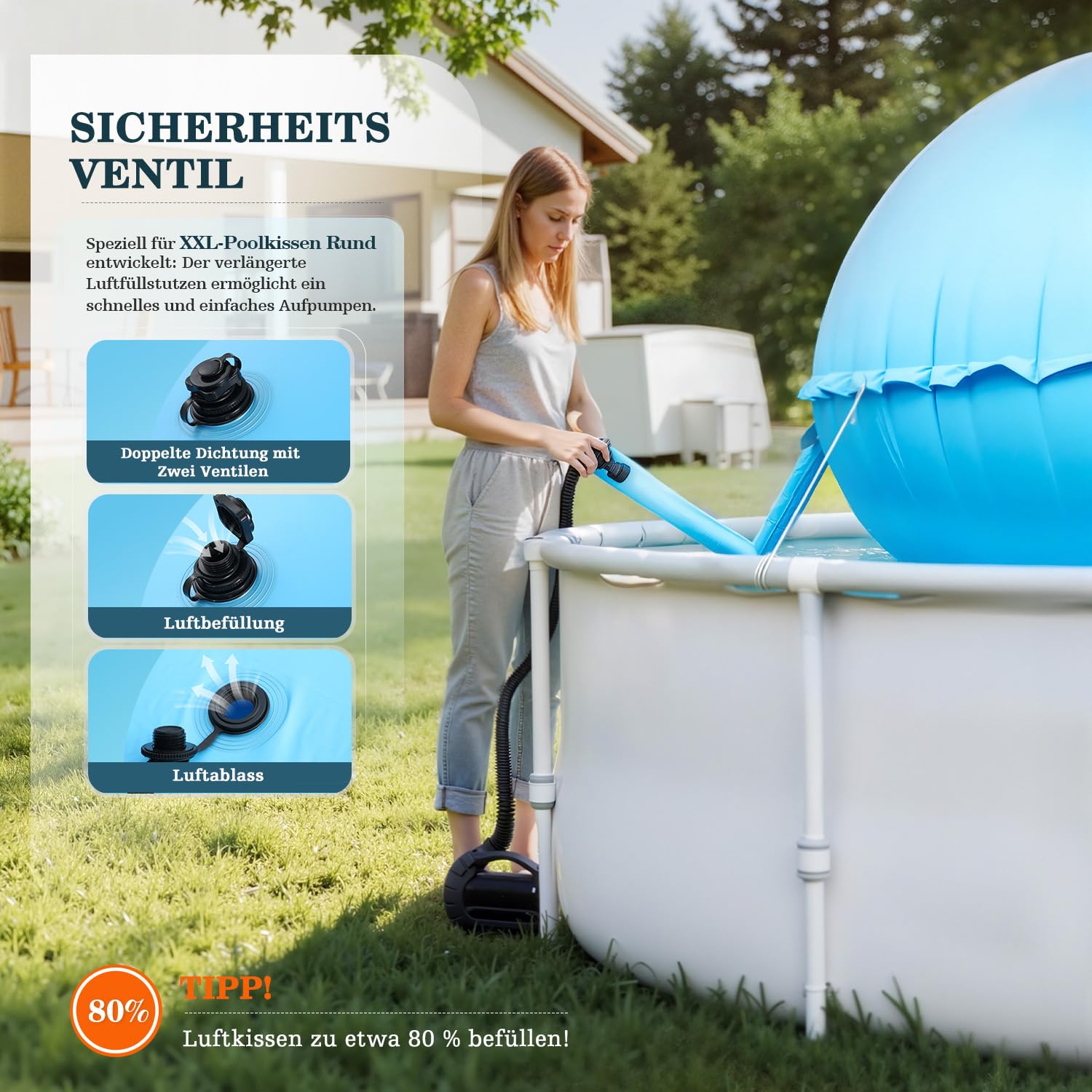 Das Kissen schützt Ihren Pool gleich doppelt: Es nimmt den Druck von sich bildendem Eis auf, um Risse in den Poolwänden zu verhindern. Gleichzeitig wölbt es die Abdeckplane nach oben, sodass Regen und Schnee ablaufen können, was die Plane entlastet und ihre Lebensdauer deutlich verlängert.