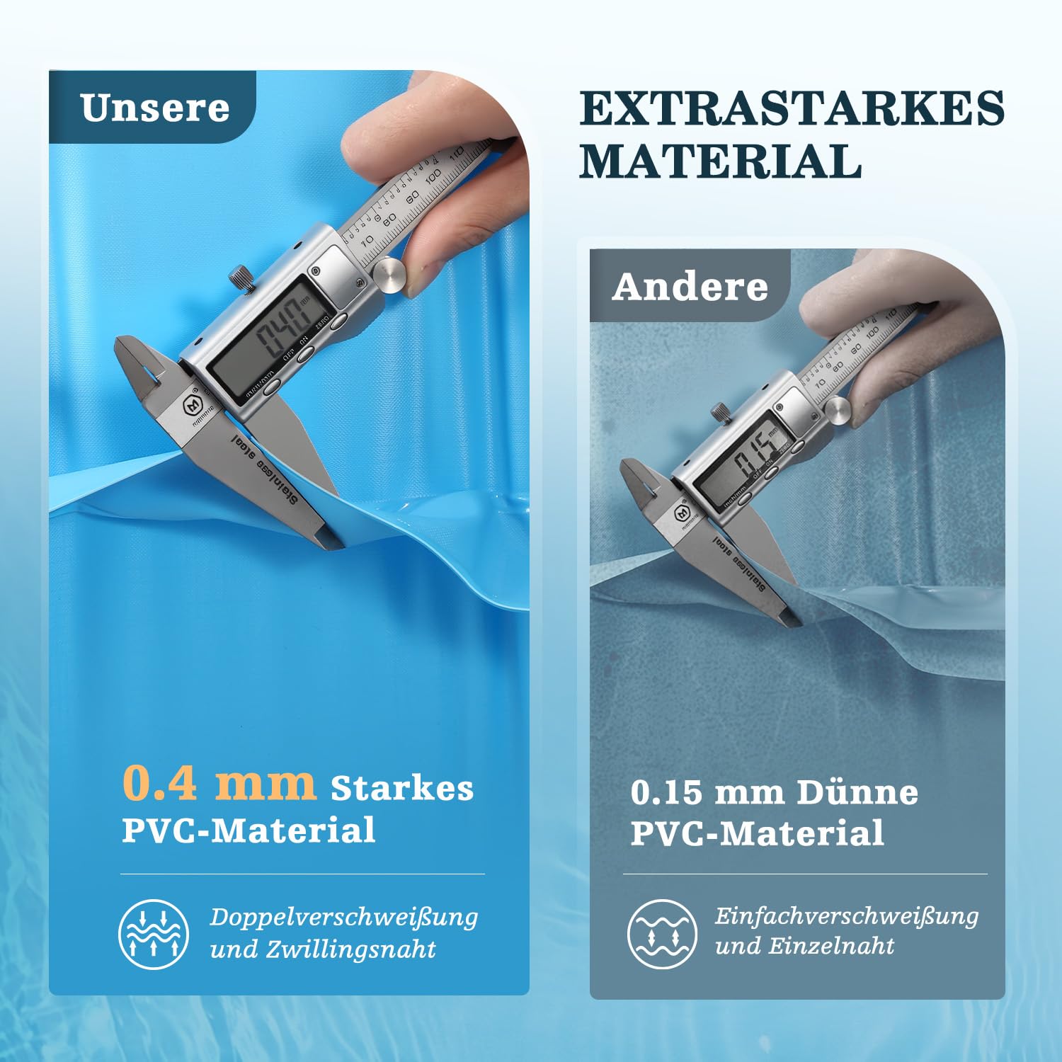 Es besteht aus extra dickem (0,4 mm), chlorbeständigem PVC-Material, das fast dreimal stärker ist als bei Standardmodellen. Verstärkte Doppelnähte beugen Rissen vor und das Material bleibt selbst bei extremen Temperaturen von bis zu -20 °C stabil und einsatzbereit.