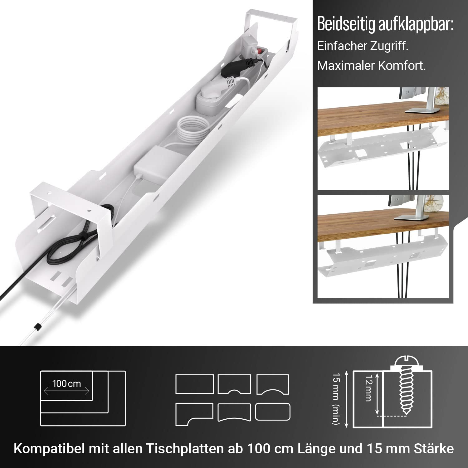 Dank des durchdachten Designs können Sie jederzeit mühelos auf Ihre Kabel zugreifen. Die Wanne lässt sich flexibel beidseitig aufklappen, sodass Sie nichts demontieren müssen.
