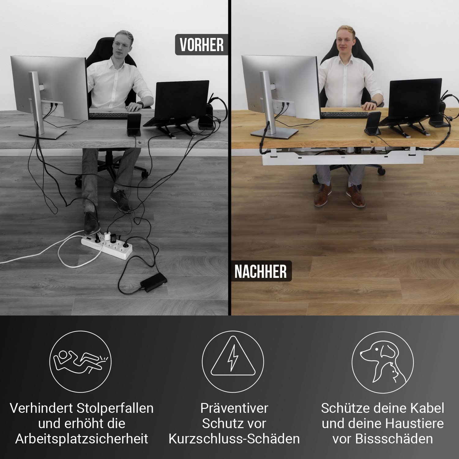 Schaffen Sie eine ablenkungsfreie und produktive Umgebung. Ob im Home-Office, im Büro oder beim Gaming-Setup – dieser Kabelkanal sorgt für eine dauerhaft saubere und professionelle Optik, indem er unschönen Kabelsalat komplett verschwinden lässt.