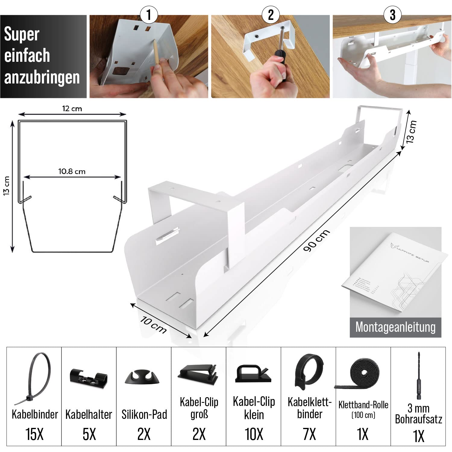 Bringen Sie mit dieser durchdachten Kabelwanne im Handumdrehen Ordnung unter Ihren Schreibtisch. Sie bietet eine elegante und effiziente Lösung, um Kabel, Netzteile und Mehrfachstecker unsichtbar zu verstauen und für eine aufgeräumte Arbeitsfläche zu sorgen.