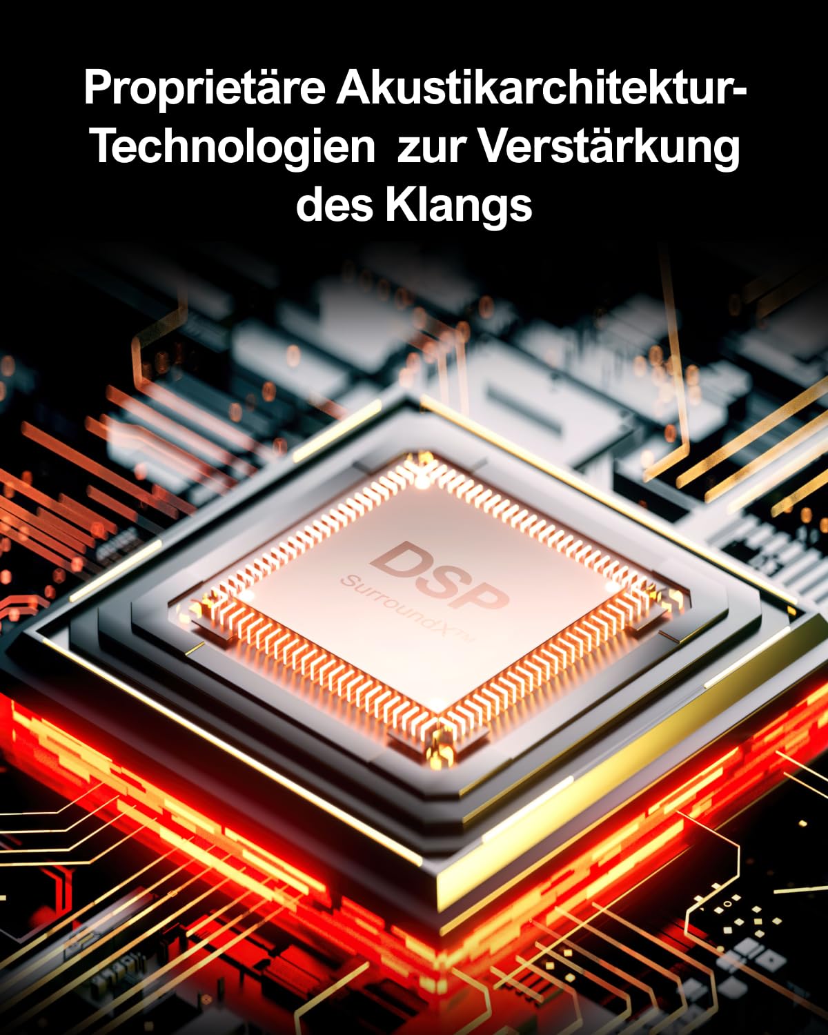 - SurroundX-Technologie: Ein intelligenter Algorithmus rechnet herkömmliche 2.0-Audiosignale in ein immersives 5.1-Surround-Signal um, sodass der Klang Sie von allen Seiten realistisch umgibt.