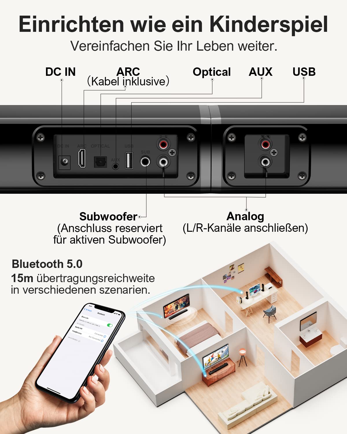 Die Verbindung ist sehr einfach. Die Soundbar bietet Anschlüsse für ARC, Optisches Kabel, AUX und USB. Alle für die Einrichtung benötigten Kabel sind bereits im Lieferumfang enthalten. Zusätzlich können Sie Geräte wie Smartphones oder Tablets kabellos und stabil über Bluetooth 5.3 verbinden.
