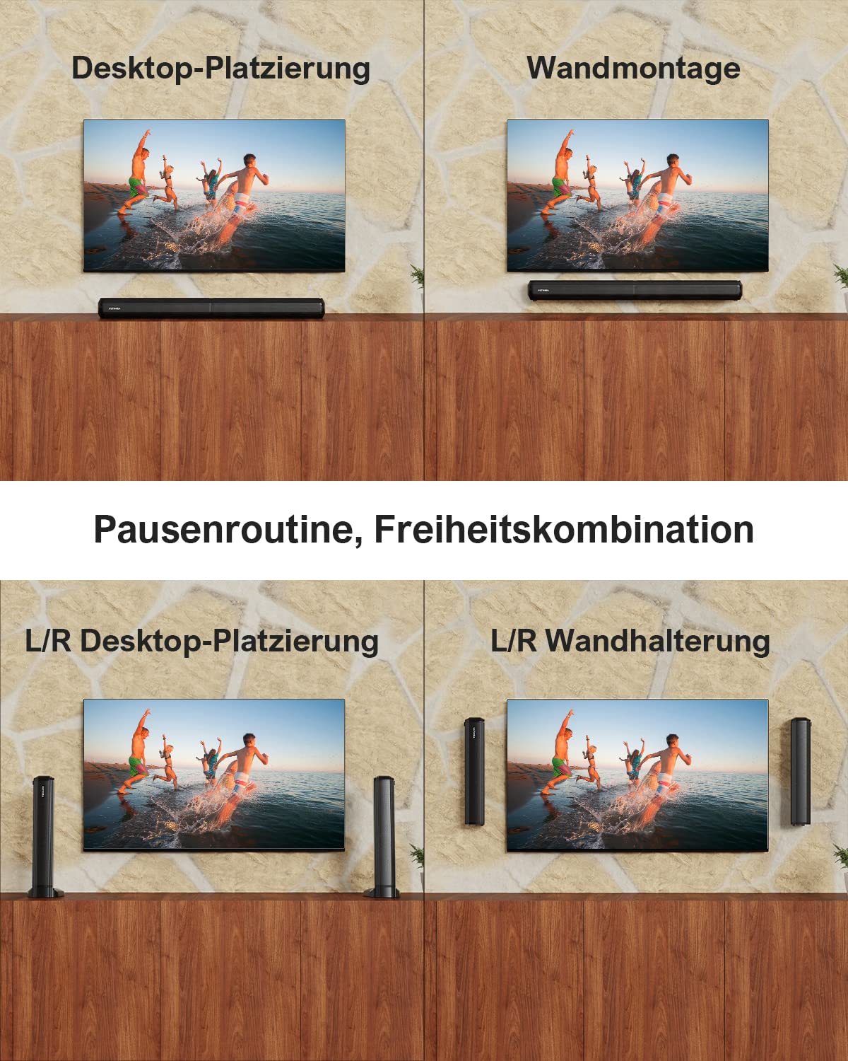 Ihr einzigartiges, teilbares 2-in-1-Design. Sie können sie als klassische, einzelne Soundbar unter Ihrem Fernseher platzieren oder in zwei separate Lautsprecher aufteilen und diese vertikal aufstellen. Das schafft ein breiteres Stereoklangfeld und passt sich perfekt an jeden Raum an.