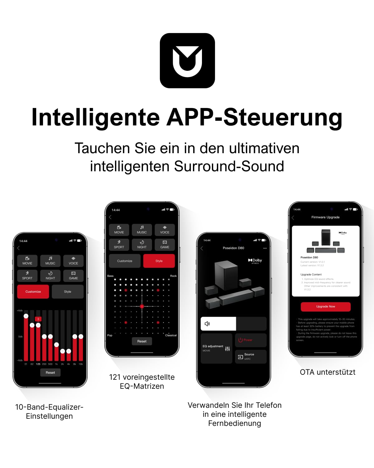 Mit der ULTIMEA Smart App haben Sie die volle Kontrolle über Ihr Klangerlebnis. Die App bietet detaillierte EQ-Modi für verschiedene Inhalte wie Film, Musik oder Gaming und über 120 Experten-Voreinstellungen. Ausserdem hält die App Ihr System durch Over-the-Air-Updates (OTA) automatisch auf dem neuesten Stand.