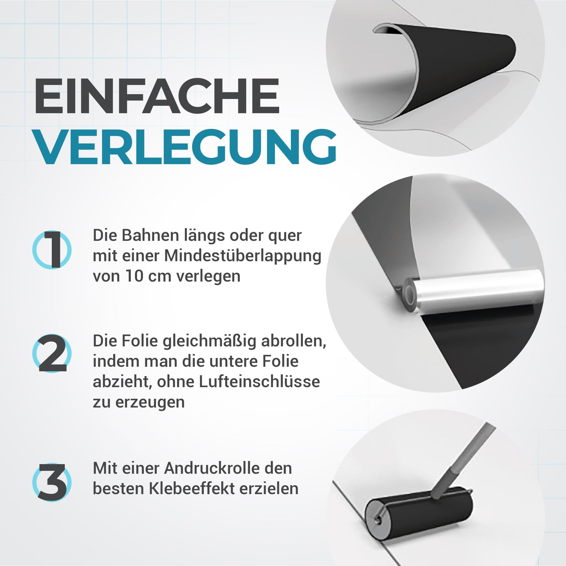 Die Verlegung ist denkbar einfach und erfordert keine Vorkenntnisse. Sie ziehen die Schutzfolie ab, positionieren die Bahn auf dem sauberen und trockenen Untergrund und drücken sie fest an. Für eine optimale Haftung, besonders bei Überlappungen, wird das Andrücken mit einer Andruckrolle empfohlen.