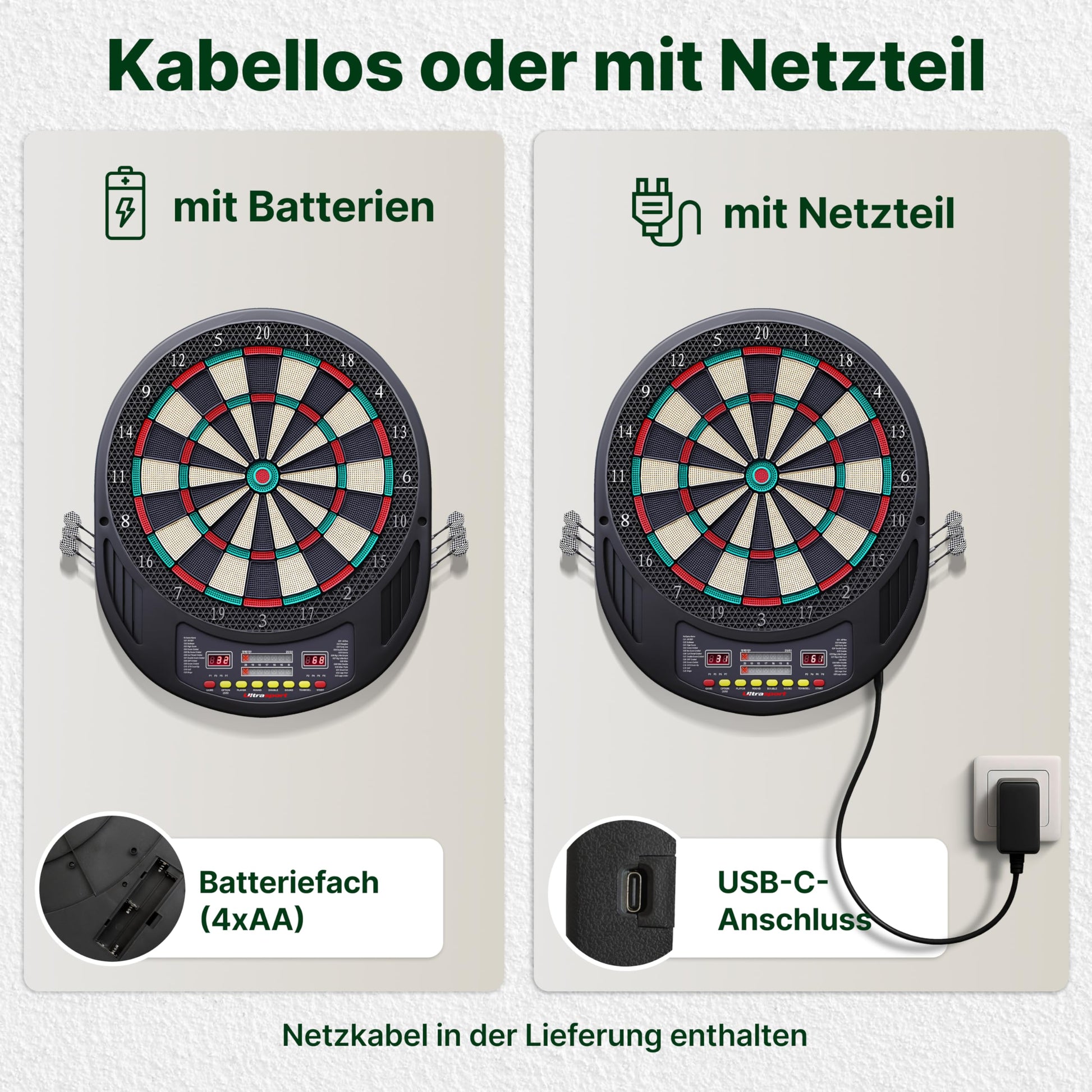 - Flexibler Betrieb: Die Dartscheibe kann sowohl mit dem beiliegenden Netzteil als auch kabellos mit Batterien (4xAA, nicht inkl.) betrieben werden.