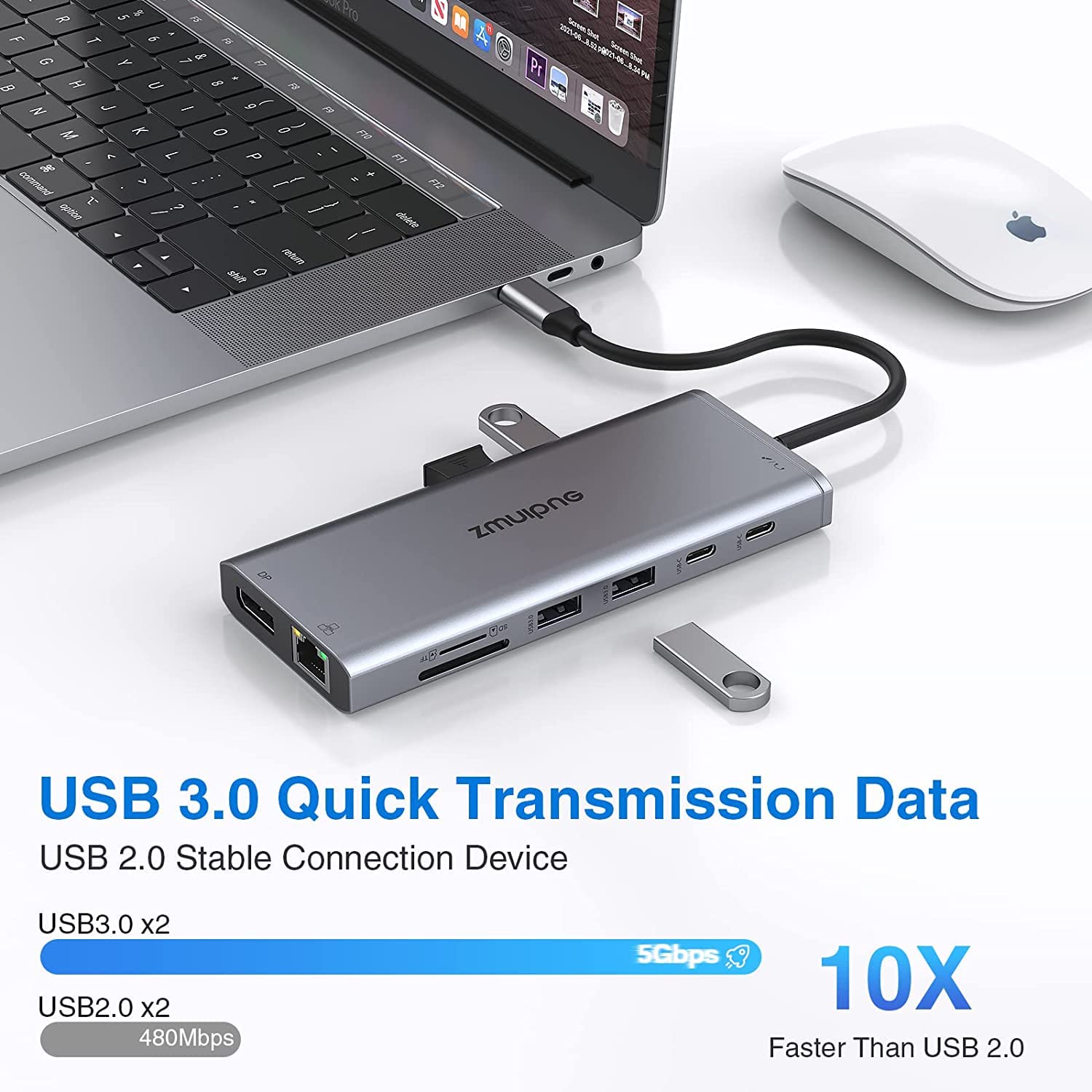 - 14-in-1-Konnektivität: Bietet zwei 4K-HDMI-Anschlüsse, einen DisplayPort, Gigabit-Ethernet, zwei USB 3.0-, zwei USB 2.0- und zwei USB-C-Datenports, einen SD/MicroSD-Kartenleser sowie einen 3.5-mm-Audio/Mikrofon-Anschluss.