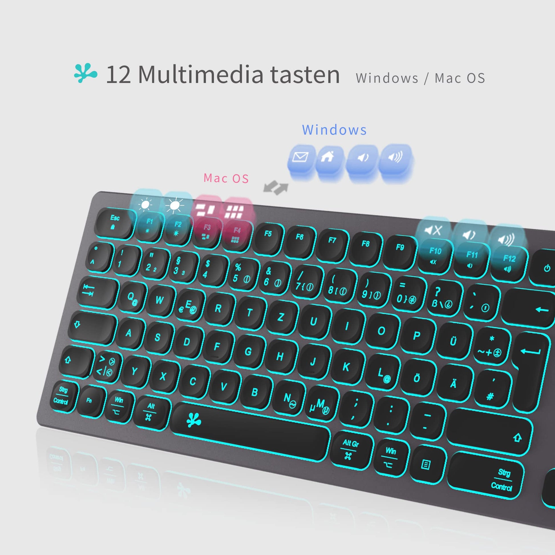 Universell kompatibel: Die Tastatur ist sowohl mit Windows (11/10/8/7/XP/2000/Vista) als auch mit Mac OS vollständig kompatibel. Die 12 Multimedia-Tasten sind speziell für beide Betriebssysteme optimiert, um Ihre Produktivität zu steigern.