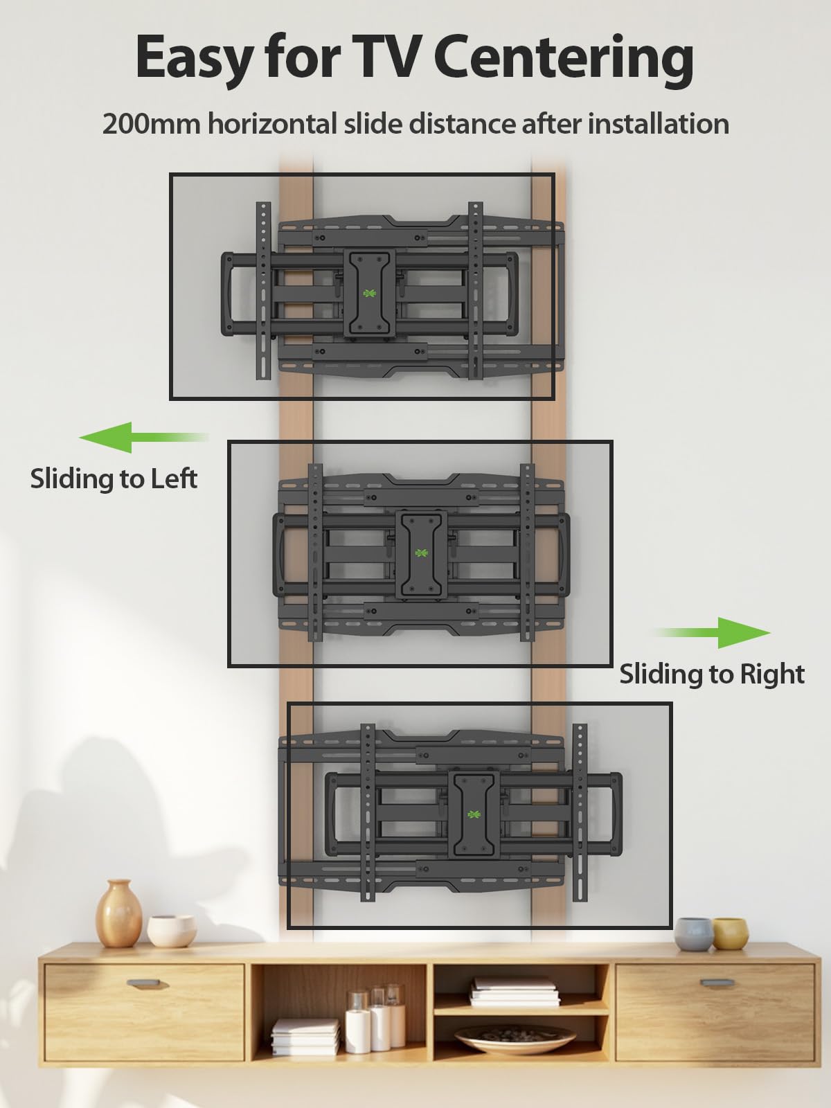 Keine Sorge. Die Halterung bietet eine einzigartige seitliche Verschiebung von 203 mm. Dadurch können Sie den Fernseher nach der Anbringung an der Wandplatte einfach nach links oder rechts schieben, um ihn perfekt zu zentrieren.