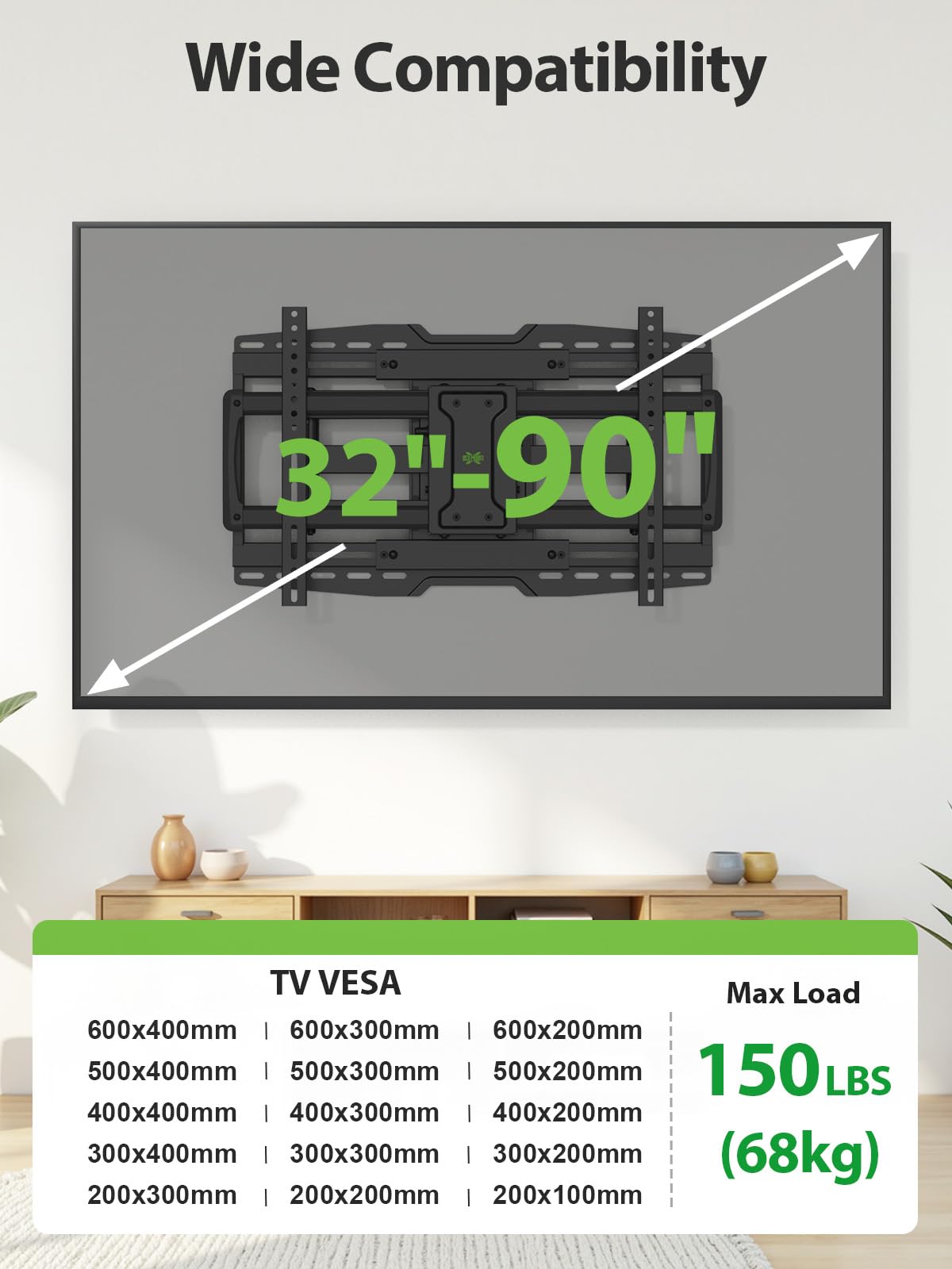 - Hohe Kompatibilität: Geeignet für die meisten Flachbildfernseher von 32 bis 90 Zoll (81-229 cm) mit einem Gewicht von bis zu 68,2 kg.