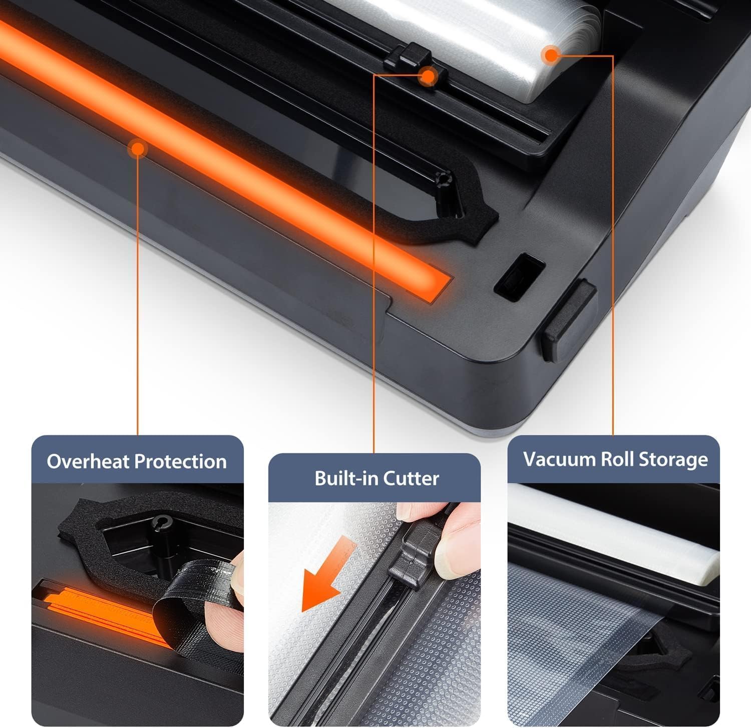 - Integrierter Cutter und Rollenfach: Mit dem eingebauten Schneidemesser erstellen Sie Beutel in der gewünschten Grösse direkt von der Rolle, die praktisch im Gerät verstaut wird. Die grosszügige Breite von 30 cm erlaubt das gleichzeitige Versiegeln mehrerer Beutel.