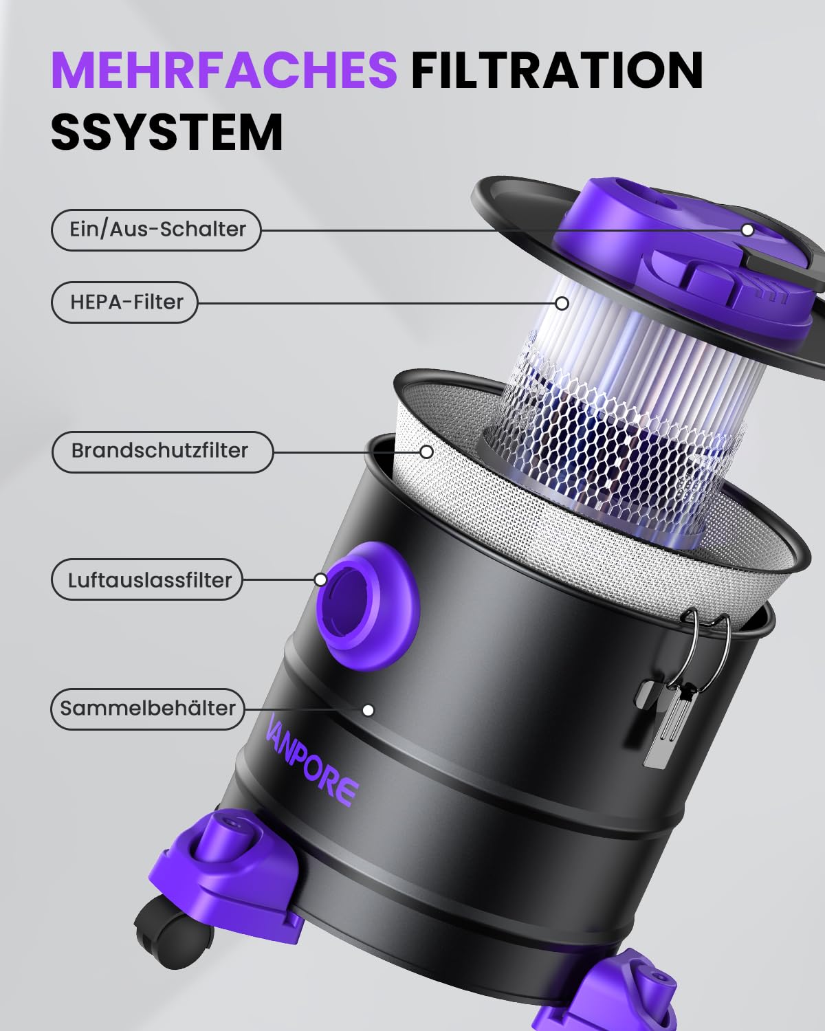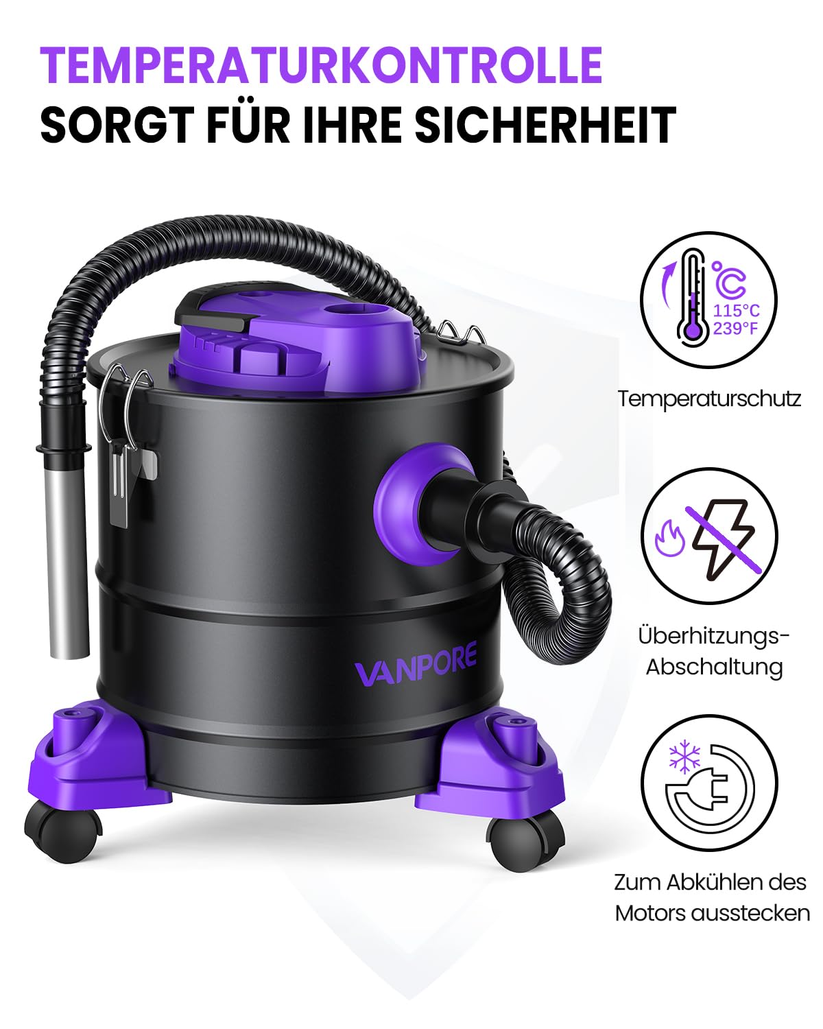 VANPORE Aschesauger 20L 1200W - Kaminstaubsauger Lila