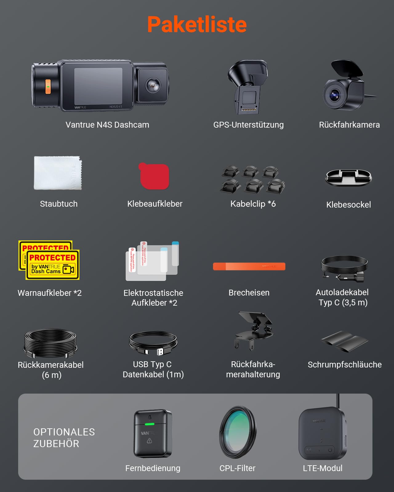 Die VANTRUE N4S ist eine fortschrittliche 3-Kanal-Dashcam, die eine lückenlose Überwachung der Fahrzeugfront, des Innenraums und des Hecks in herausragender Bildqualität sicherstellt. Sie wurde für anspruchsvolle Fahrzeugbesitzer entwickelt, die umfassende Sicherheit und zuverlässige Beweisaufnahmen in jeder Situation verlangen.