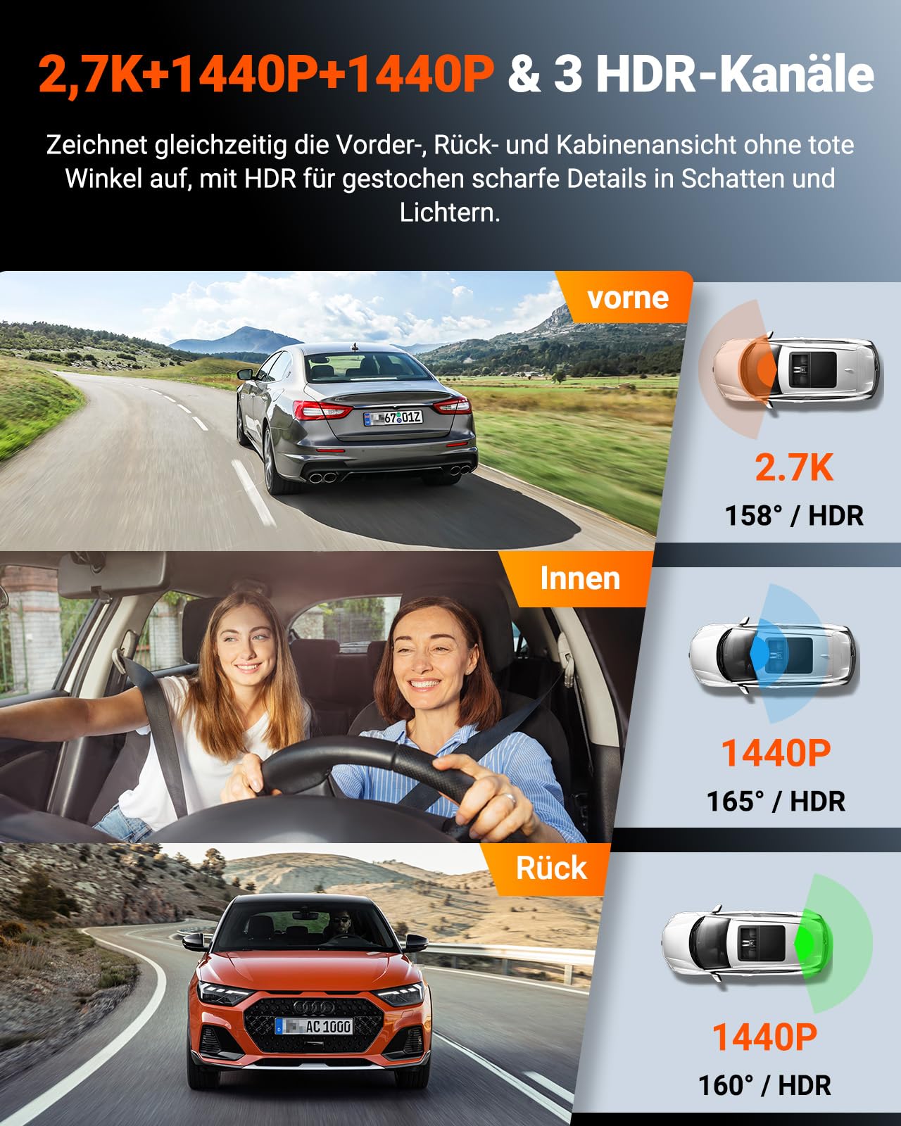 - 3-Kanal-Aufnahme: Zeichnet gleichzeitig mit 1944P (Front), 1440P (Innen) und 2.5K (Heck) auf und erfasst dank Weitwinkelobjektiven (158°+165°+160°) ein breites Sichtfeld.