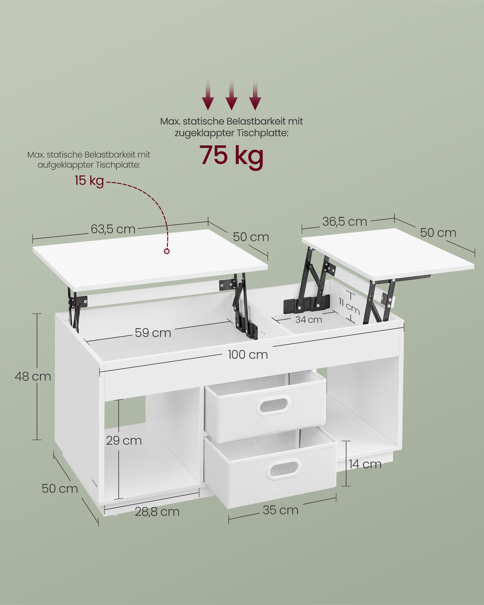 Der Tisch ist ein wahres Stauraumwunder. Er verfügt über zwei grosse, verdeckte Fächer unter der anhebbaren Platte, zwei leicht zugängliche Schubladen sowie zwei offene Ablagen – perfekt, um Bücher, Fernbedienungen und andere Utensilien ordentlich zu verstauen.