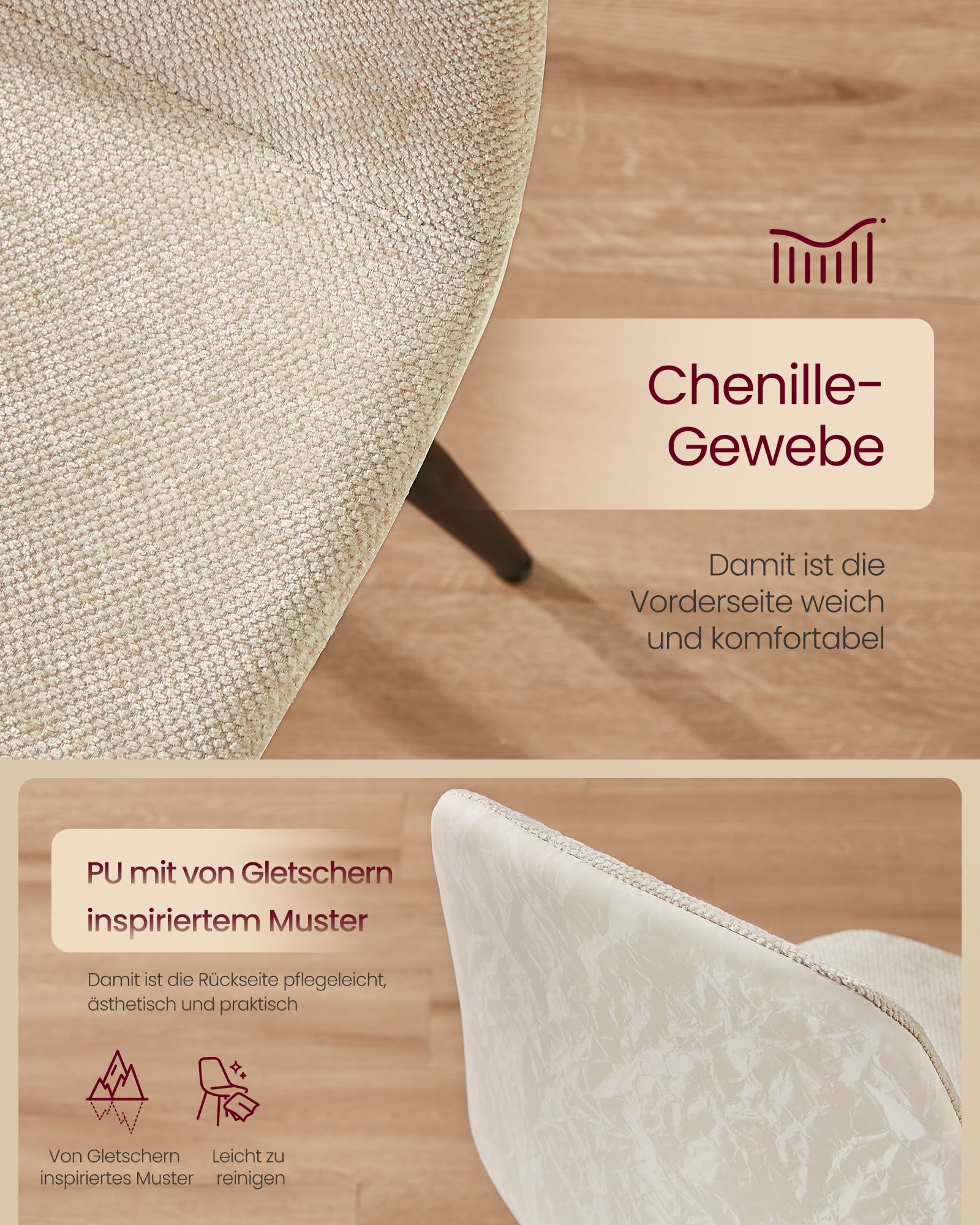Die raffinierte Kombination aus weichem Chenille und dem kunstvollen PU-Muster auf der Rückseite macht diese Stühle zu einem echten Blickfang. Sie verleihen Ihrem Esszimmer oder Ihrer Küche sofort einen Hauch von moderner Eleganz und schaffen eine einladende Atmosphäre für Familie und Gäste.