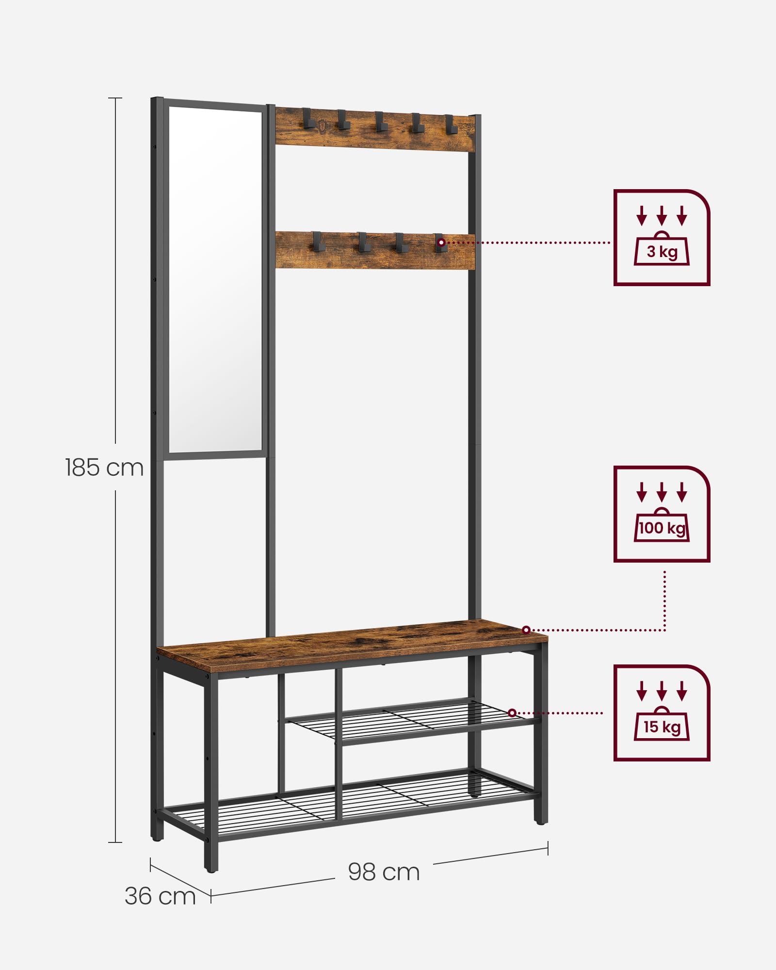 Dieser Garderobenständer ist die perfekte Lösung, um den Platz im Flur, Schlafzimmer oder Wohnzimmer maximal auszunutzen. Hängen Sie Ihre Jacken und Mäntel ordentlich auf, setzen Sie sich bequem auf die bis 100 kg belastbare Bank, um Ihre Schuhe an- oder auszuziehen, und werfen Sie einen letzten Blick in den Spiegel, bevor Sie das Haus verlassen – alles an einem Ort.