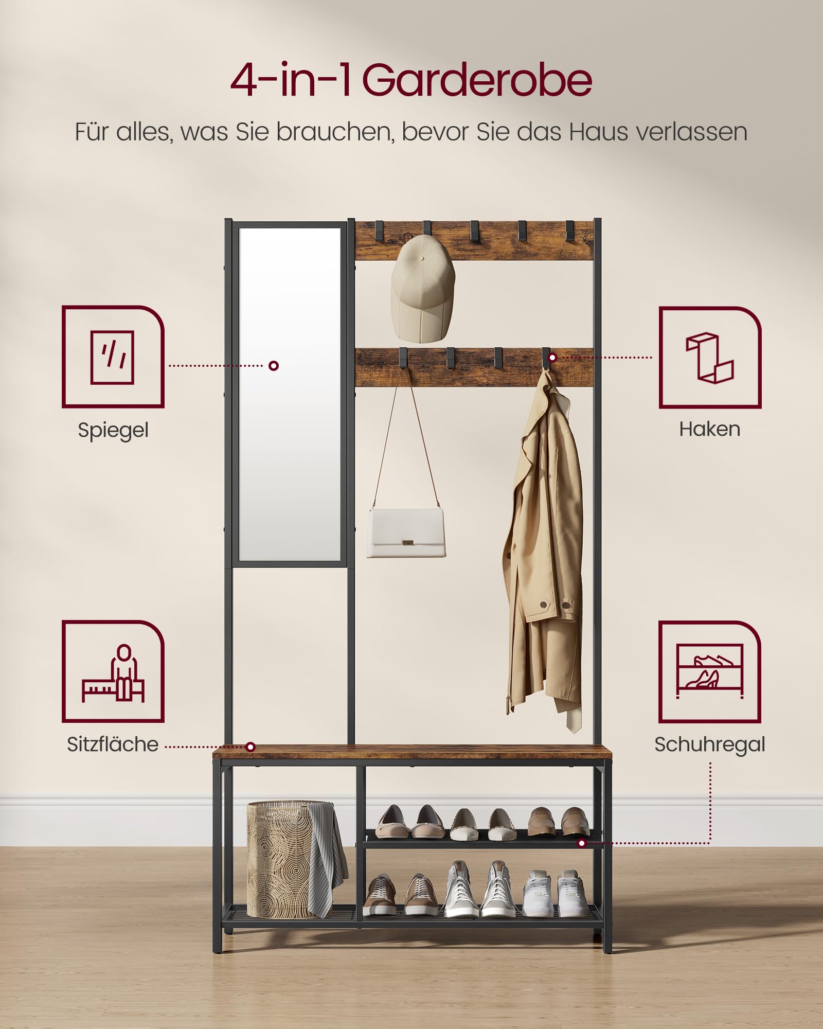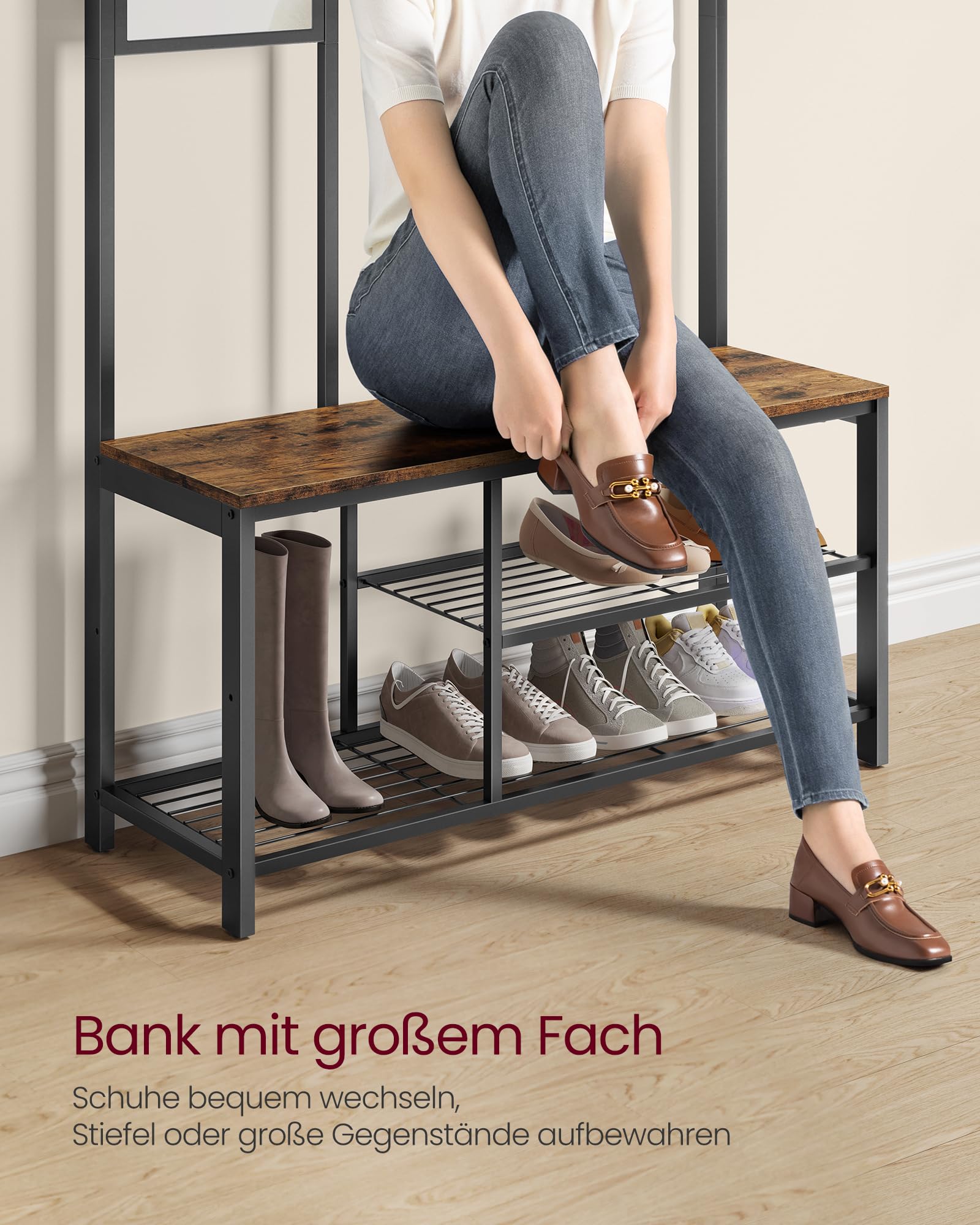 Dieses 4-in-1-Möbelstück ist ein wahres Multitalent: Es kombiniert einen Kleiderständer mit 9 flexibel verschiebbaren Haken, eine stabile Sitzbank, ein Schuhregal mit einem extra Fach für Stiefel und einen praktischen, integrierten Spiegel.
