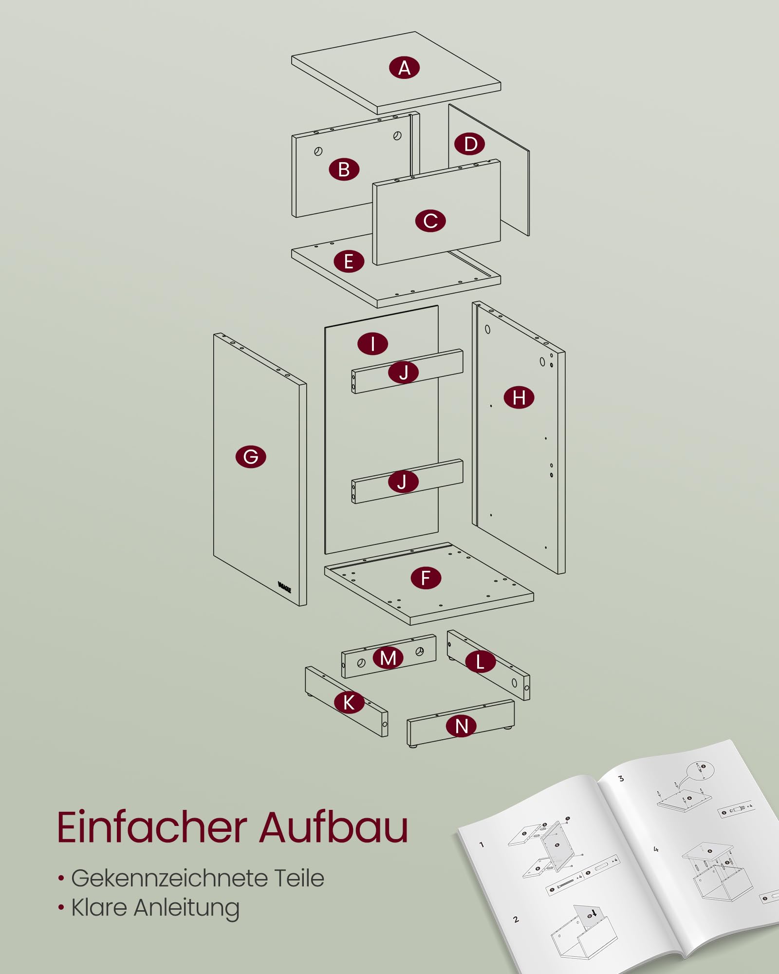 Der Aufbau ist in der Regel unkompliziert. VASAGLE-Möbel werden typischerweise mit nummerierten Einzelteilen und einer klaren, bebilderten Anleitung geliefert, um eine einfache und schnelle Montage zu ermöglichen.