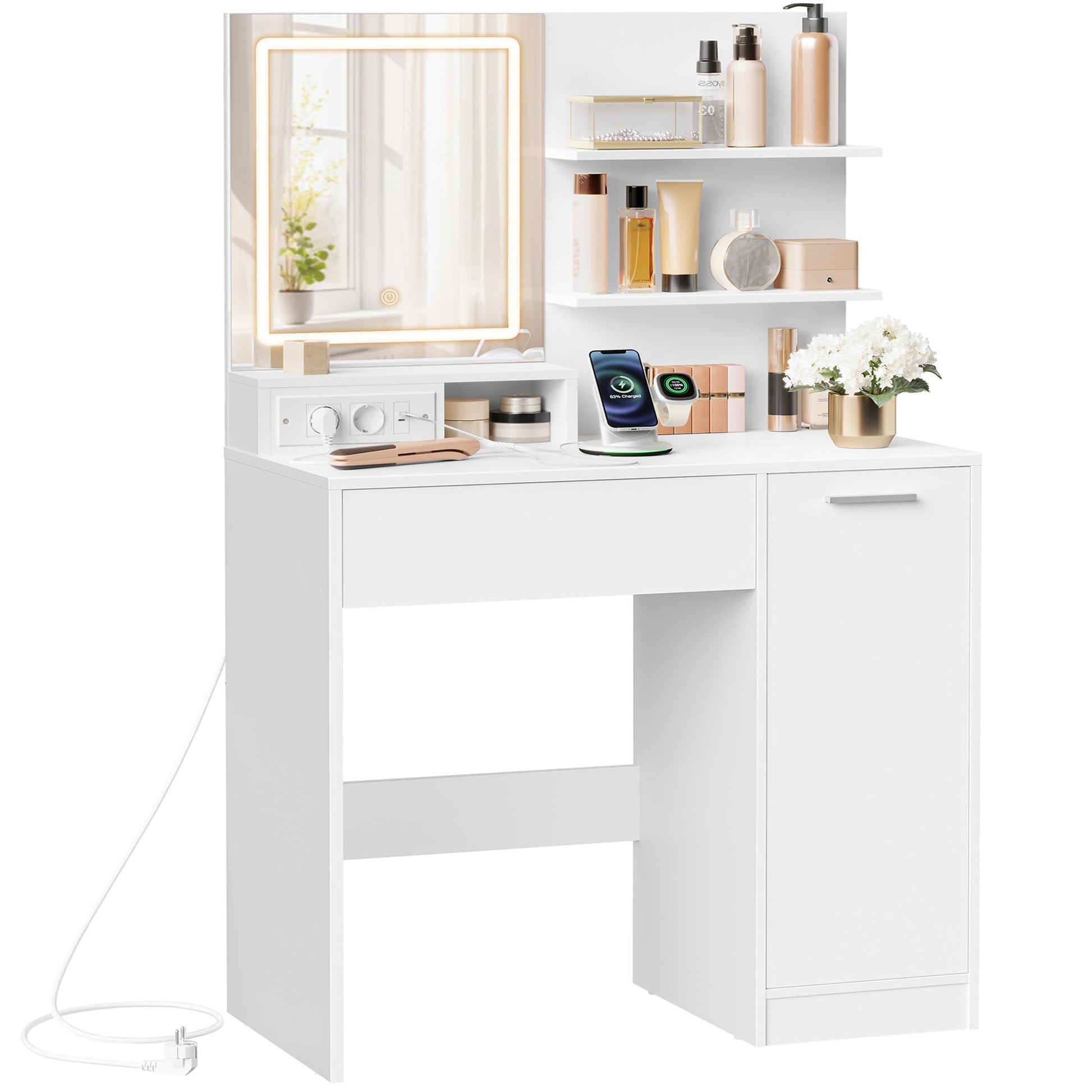 Der Tisch ist als Organisationstalent konzipiert. Er bietet reichlich Platz durch eine geräumige Schublade, einen Schrank mit zwei verstellbaren Ablagen und zusätzliche offene Regale. So finden all Ihre Kosmetika, Schmuck und Styling-Geräte einen geordneten Platz.