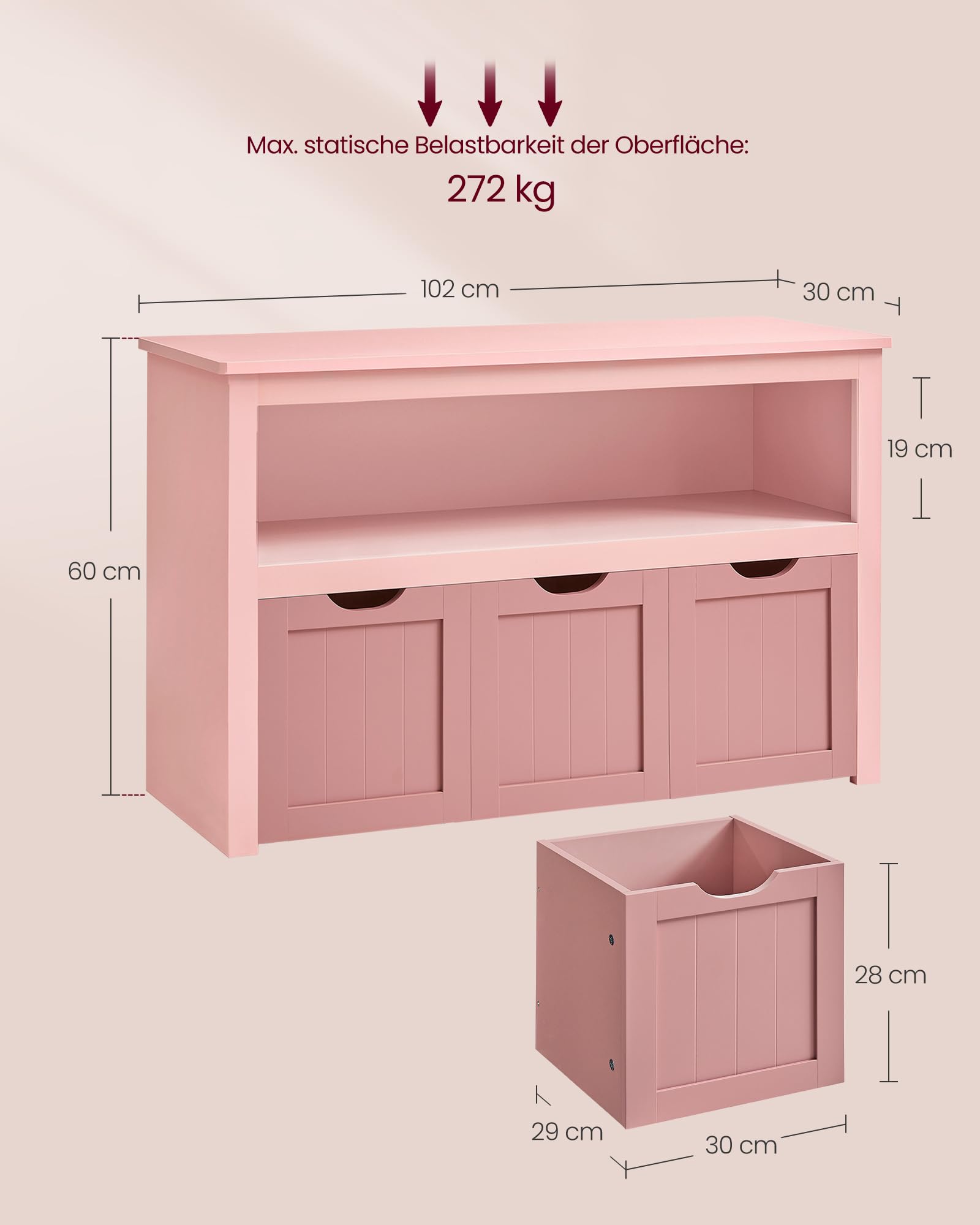 - Durchdachter Stauraum: Bietet eine obere Ablage, ein offenes Fach für Bücher und drei geräumige, herausnehmbare Boxen für Spielsachen aller Art.