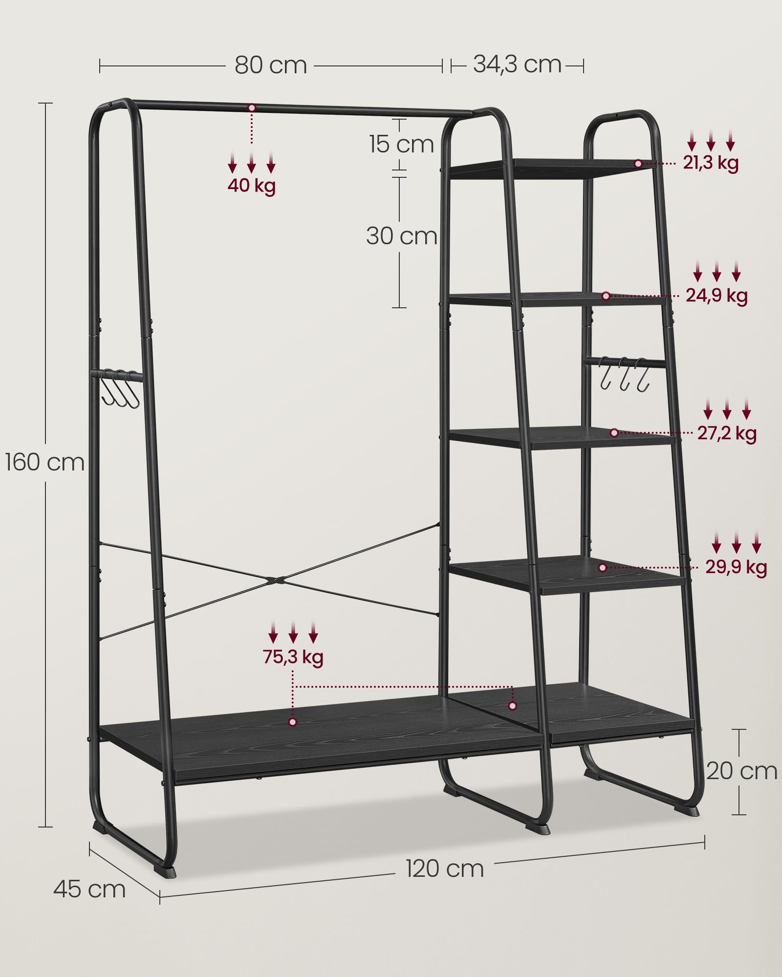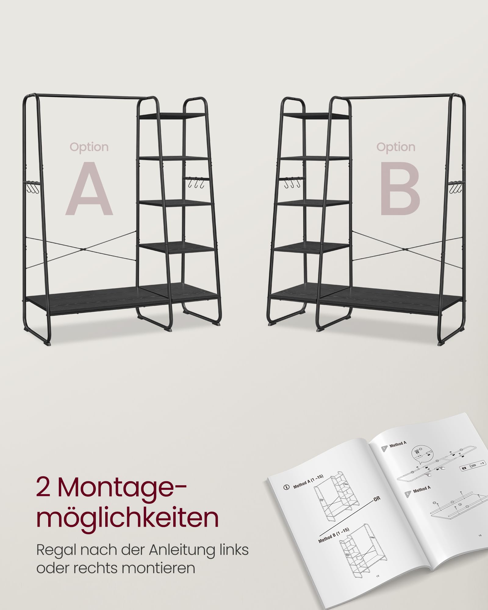 - Komplettlösung: Eine Kleiderstange für Jacken und Hemden, fünf seitliche Regalböden für Taschen oder Kisten und sechs abnehmbare Haken für Accessoires.
