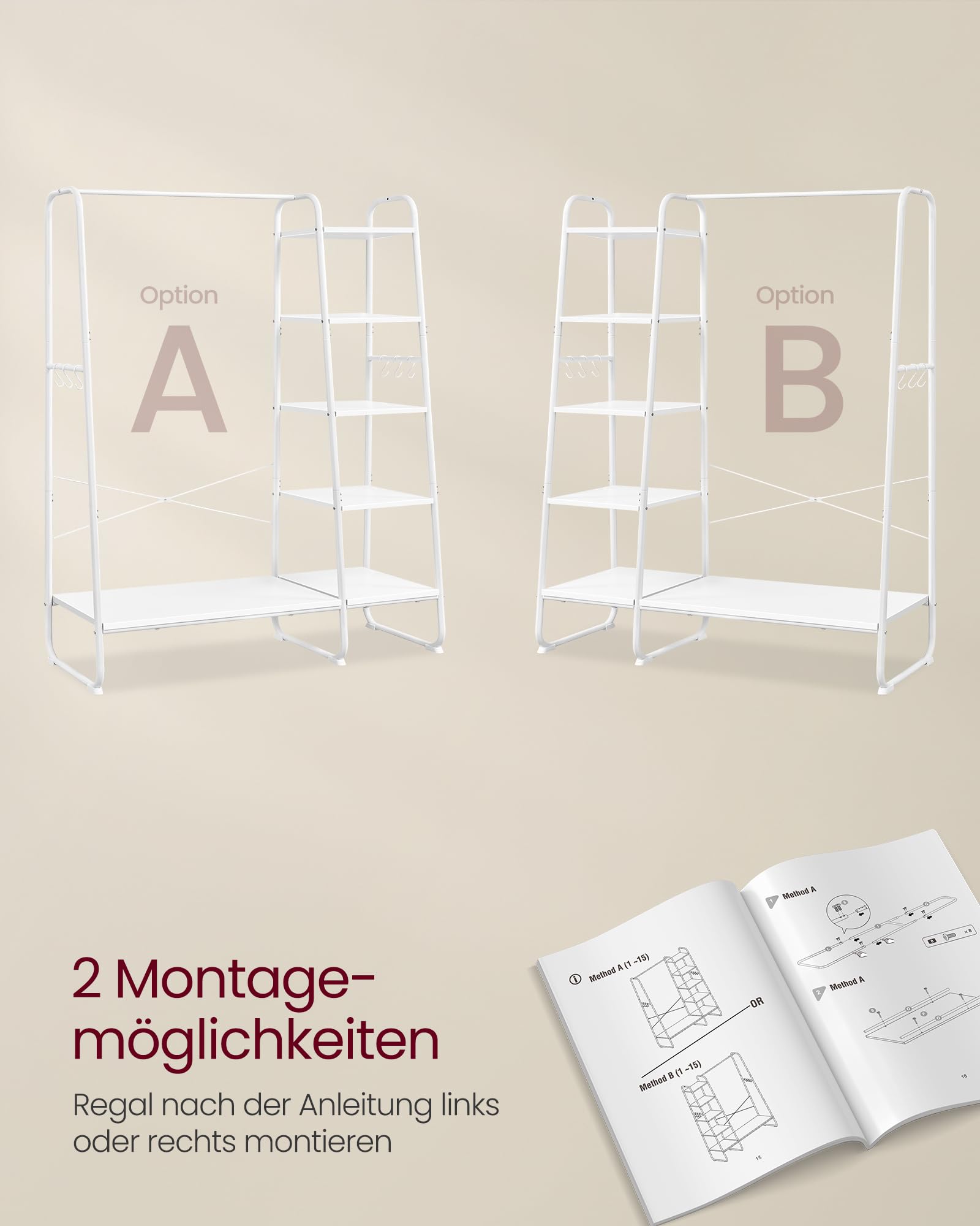 - Flexibles Design: Das fünfteilige Regal kann je nach Platz und Vorliebe wahlweise auf der rechten oder linken Seite des Kleiderständers montiert werden, was ihn vielseitig einsetzbar macht.