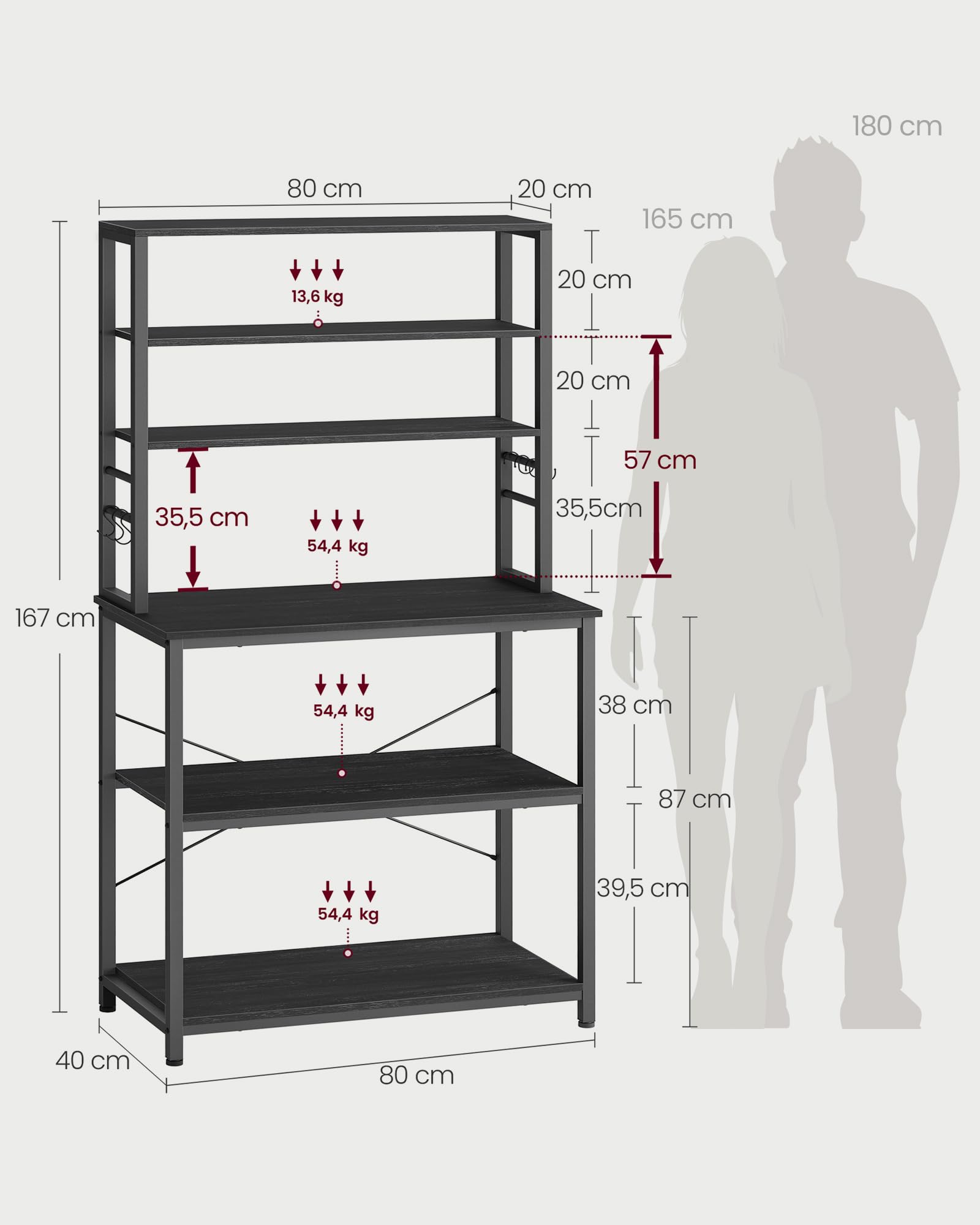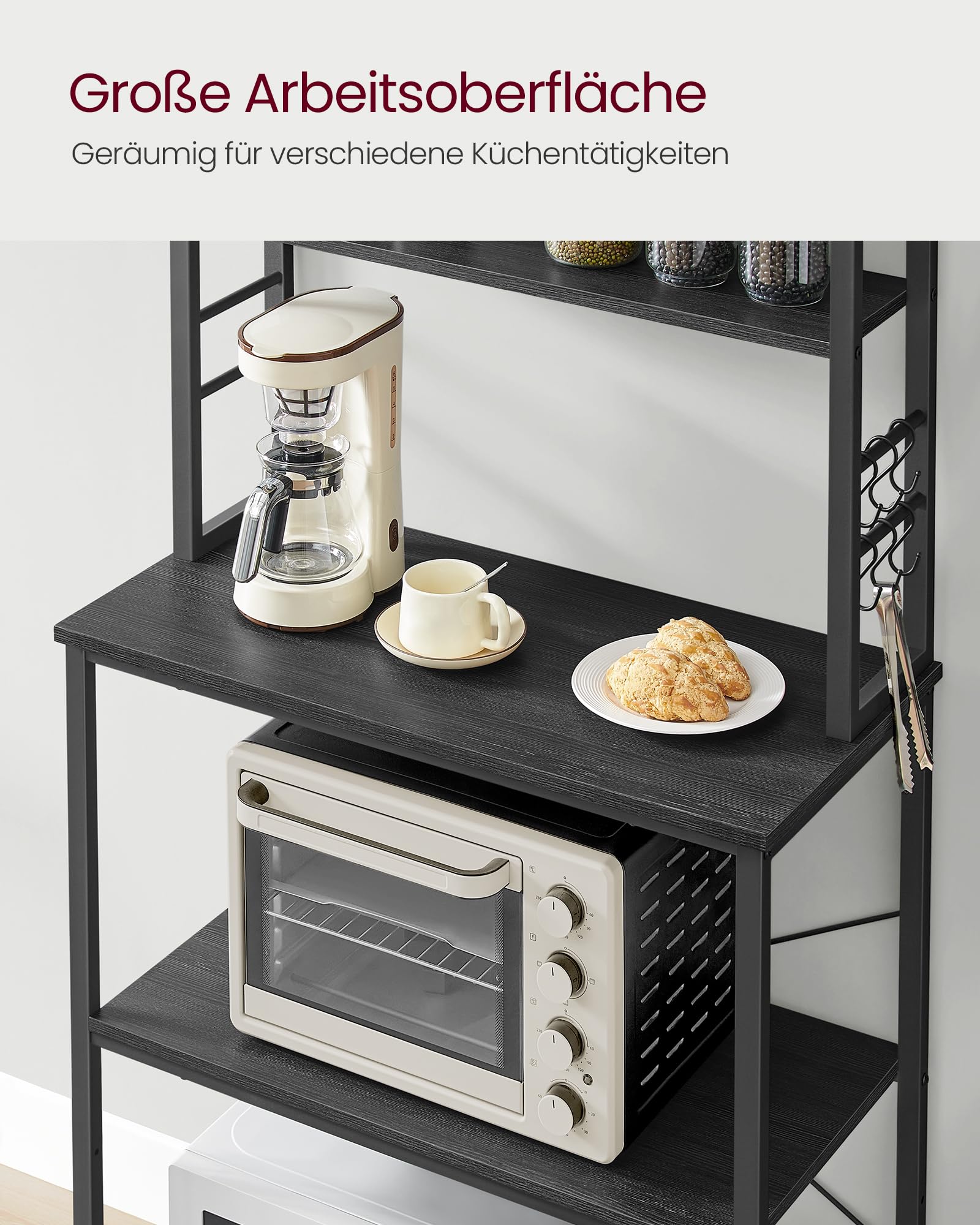 Die robuste Bauweise garantiert eine hohe Belastbarkeit, sodass auch schwerere Küchengeräte wie Mixer oder eine Heissluftfritteuse sicher Platz finden. Die sechs Ebenen bieten reichlich Stauraum und sorgen für Übersichtlichkeit und schnellen Zugriff auf alle wichtigen Utensilien.