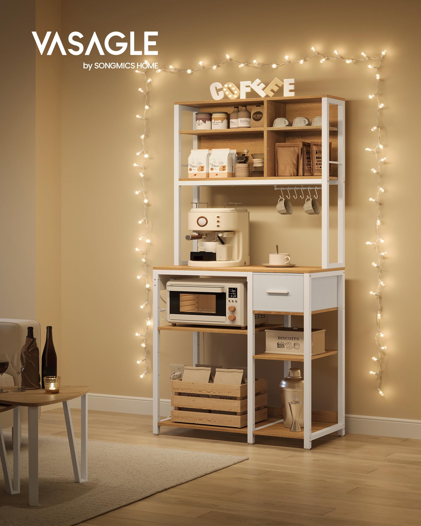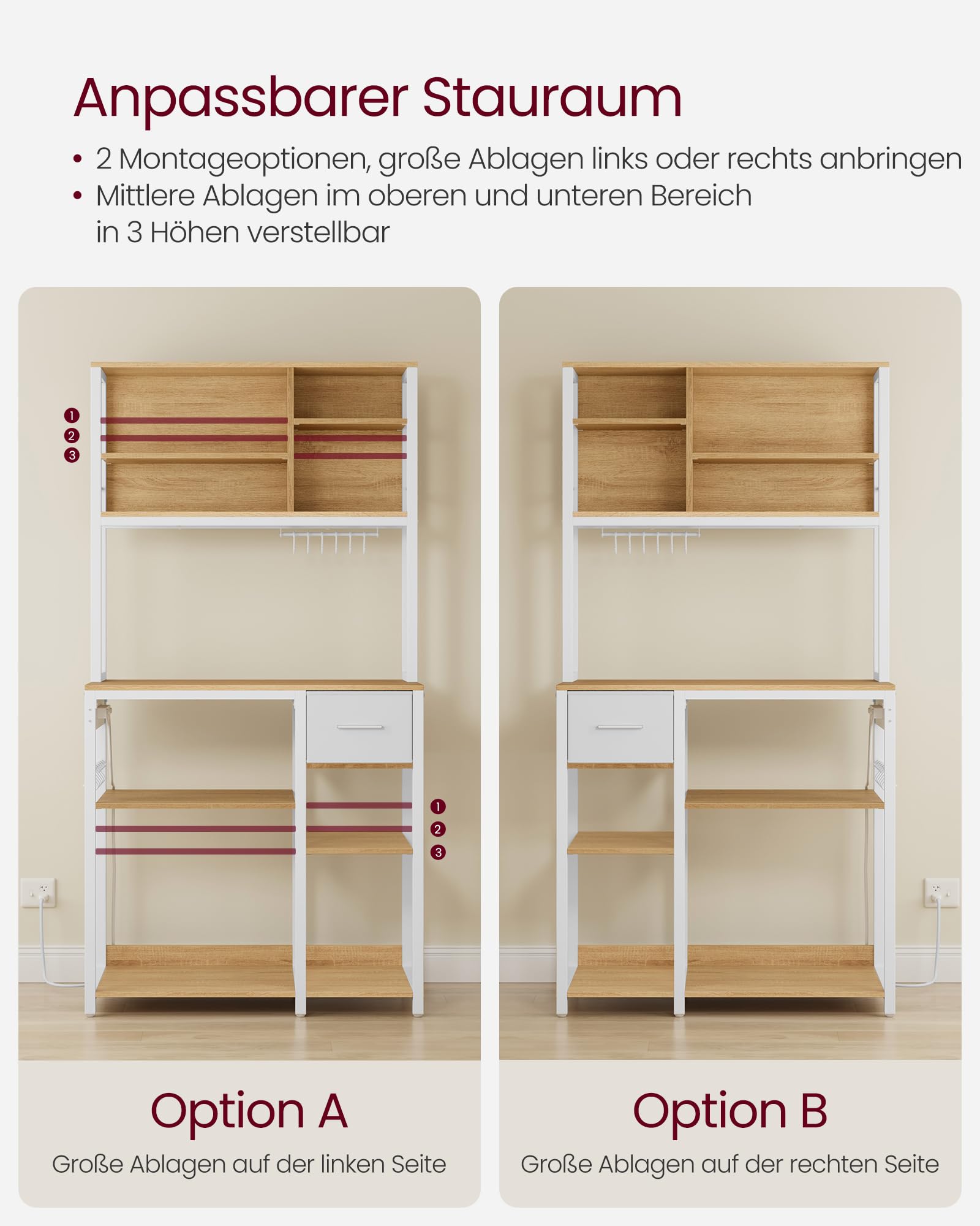 Dieses Küchenregal ist ein wahres Multitalent, das Stauraum, Arbeitsfläche und Ladestation stilvoll miteinander verbindet. Es fügt sich als praktische Kaffeeecke oder als zentrale Anrichte nahtlos in Ihre Küche ein und schafft sofort mehr Ordnung und Funktionalität.