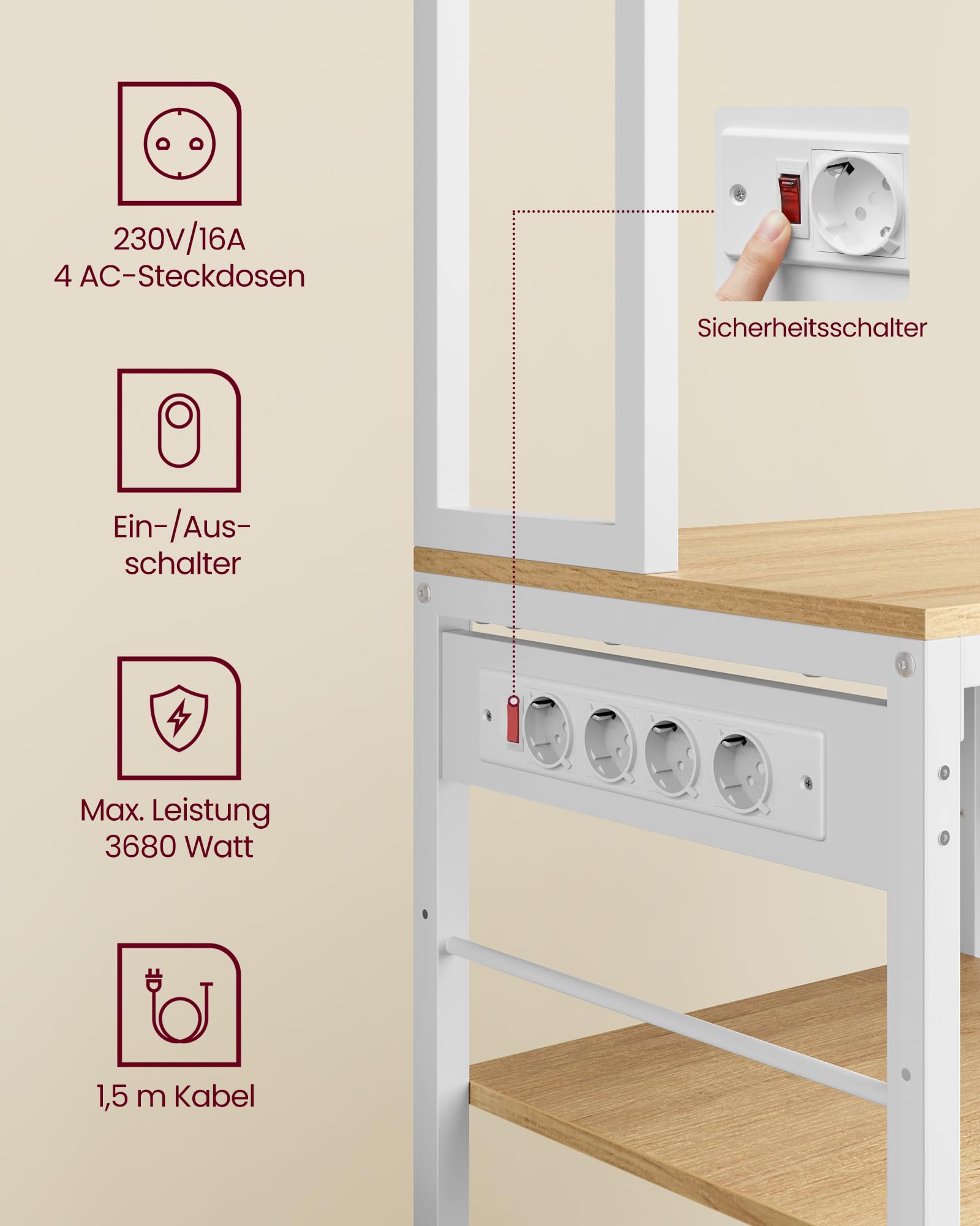 Ja, das Regal ist mit einer sicheren Steckdosenleiste ausgestattet. Sie bietet 4 AC-Anschlüsse (bis 3680 W), Überlast- und Kriechstromschutz sowie einen Ein-/Ausschalter. Ideal, um Kaffeemaschine, Mixer oder Toaster direkt am Regal anzuschliessen und Kabelsalat zu vermeiden.