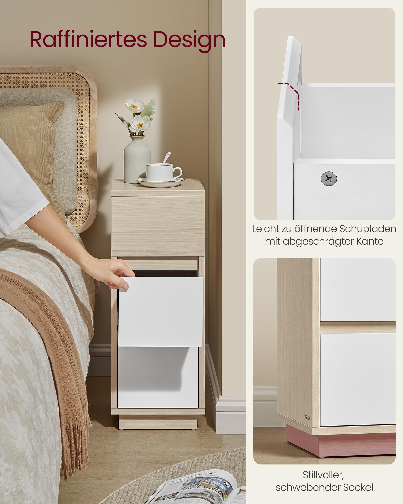 Dieses Set aus zwei schmalen VASAGLE Nachttischen ist die ideale Ergänzung für Ihr Schlafzimmer oder Wohnzimmer. Es verbindet ein modernes, zweifarbiges Design mit durchdachter Funktionalität, um auch auf kleinem Raum für Ordnung zu sorgen.