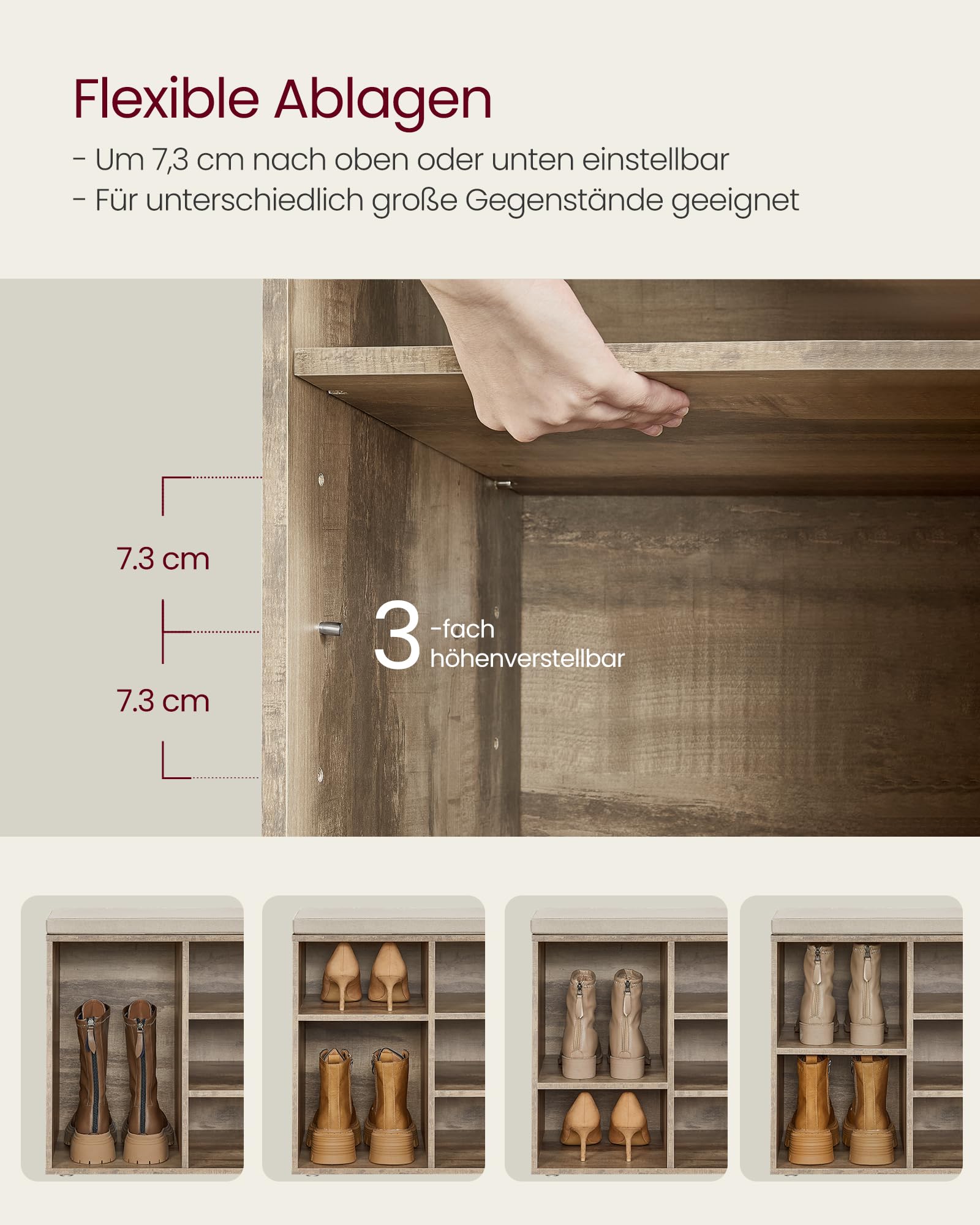 Ja, die Schuhbank ist flexibel gestaltet. Die seitlichen Ablageböden sind sowohl verstellbar als auch komplett herausnehmbar. So schaffen Sie bei Bedarf problemlos Platz für höhere Schuhe wie Stiefel, Stiefeletten oder High Heels.