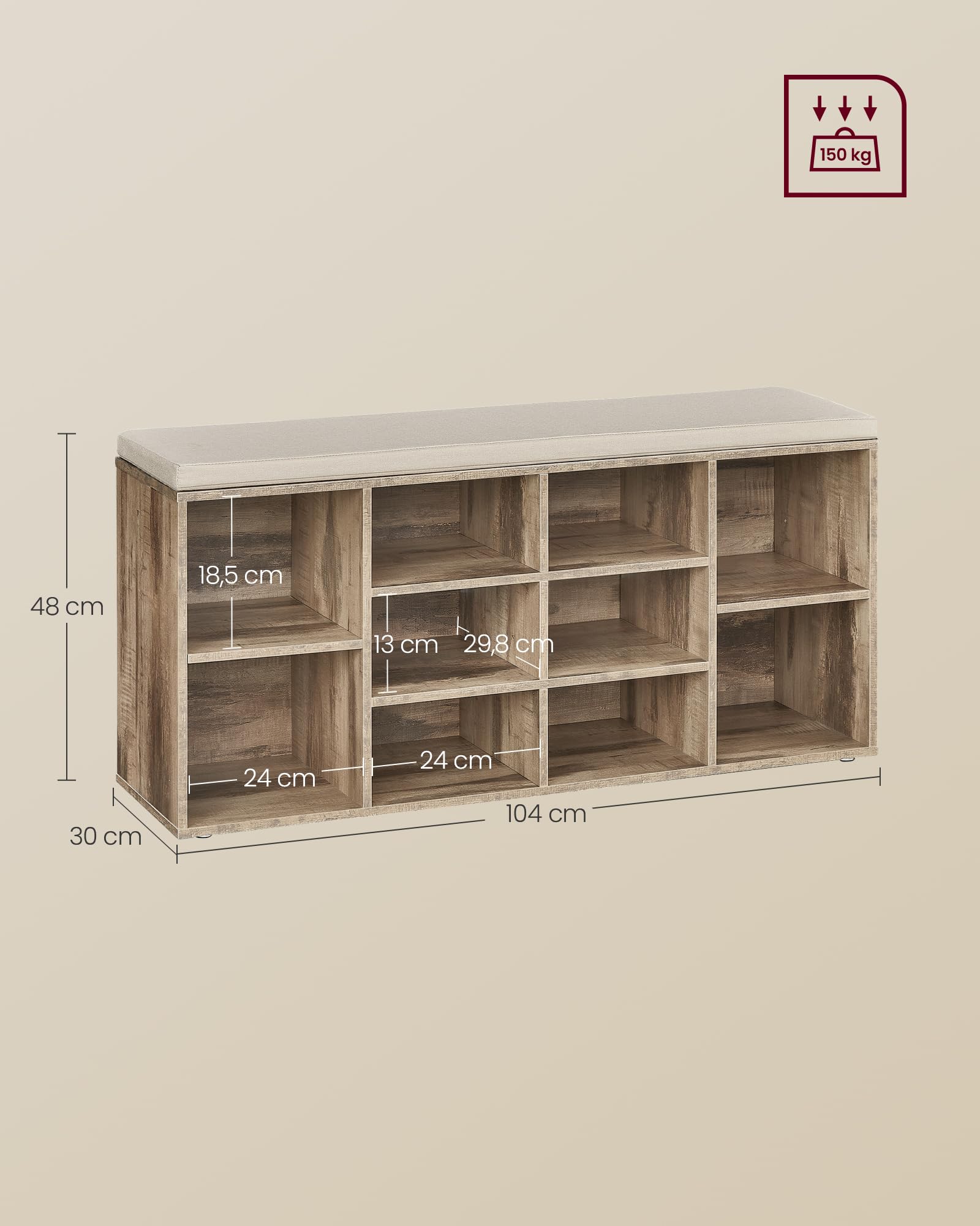 Die Bank bietet in ihren 10 Fächern Platz für mindestens 10 Paar Schuhe, je nach Schuhgrösse und -art. Die genauen Abmessungen des Möbelstücks sind 104 cm in der Breite, 48 cm in der Höhe und 30 cm in der Tiefe.