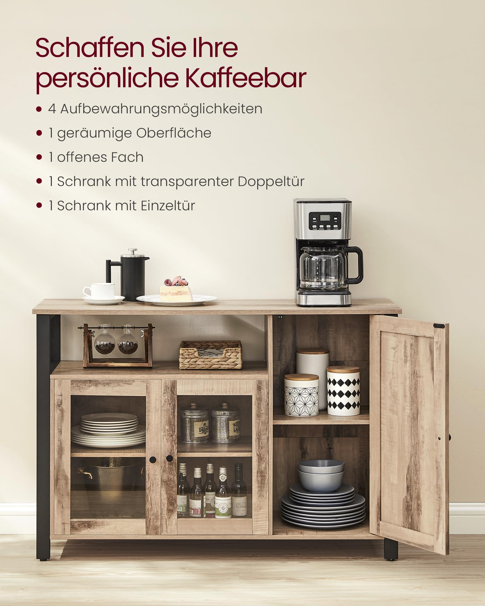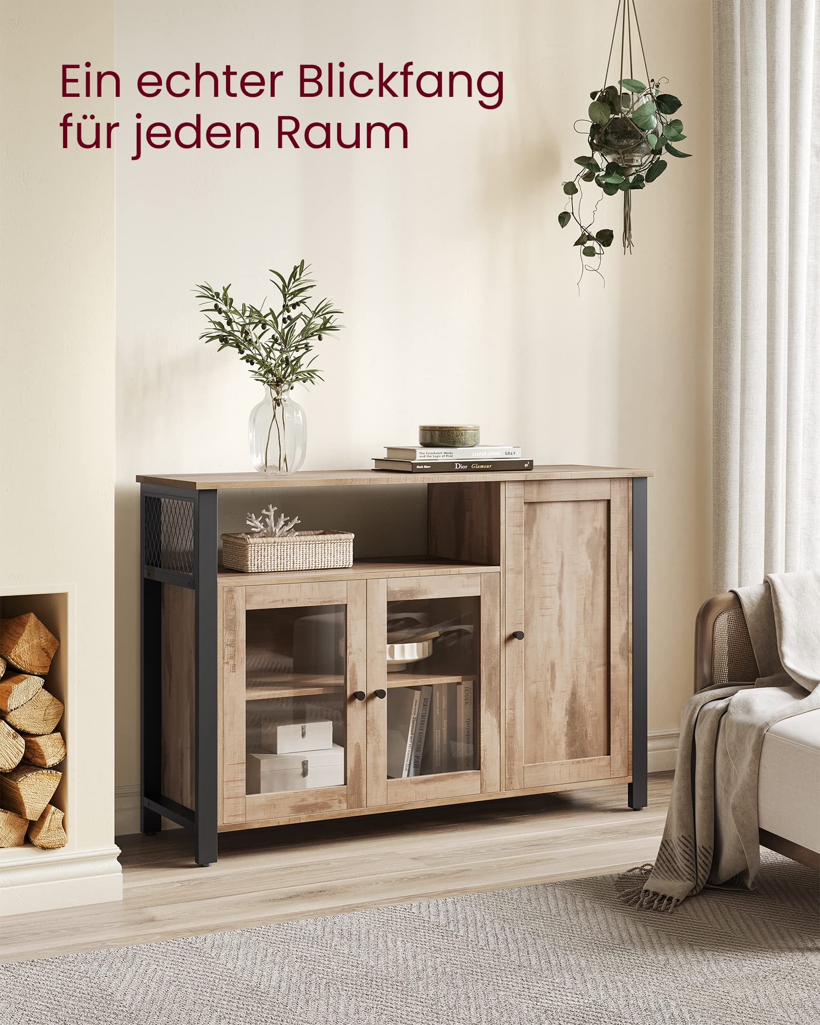 - Grosszügiger Stauraum: Eine 110 cm breite Oberfläche, ein offenes Mittelfach sowie zwei Schränke bieten reichlich Platz für Geschirr, Gläser, Dekoartikel und mehr.