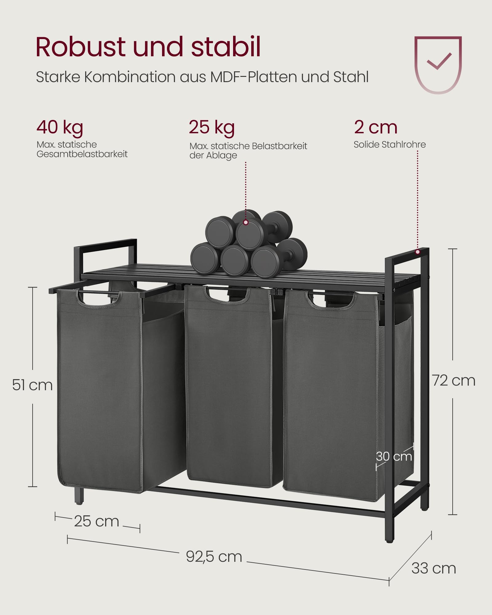 - Herausnehmbare Wäschesäcke: Die strapazierfähigen Säcke aus Oxford-Gewebe lassen sich dank Klettverschlüssen einfach herausziehen und zur Waschmaschine transportieren. Eine stabile Bodenplatte aus Kunststoff verhindert dabei das Durchhängen.