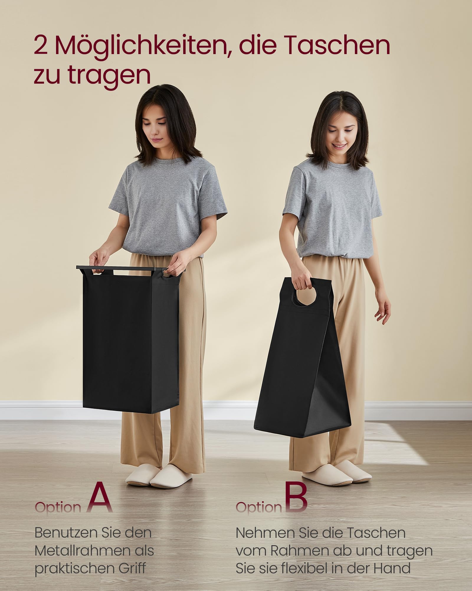Ja, die vier Säcke aus strapazierfähigem Oxford-Gewebe sind mit Klettverschlüssen am Rahmen befestigt. Sie können einfach herausgehoben werden, um die Wäsche bequem zur Waschmaschine zu tragen. Eine integrierte Bodenplatte verhindert zudem, dass die Säcke durchhängen.