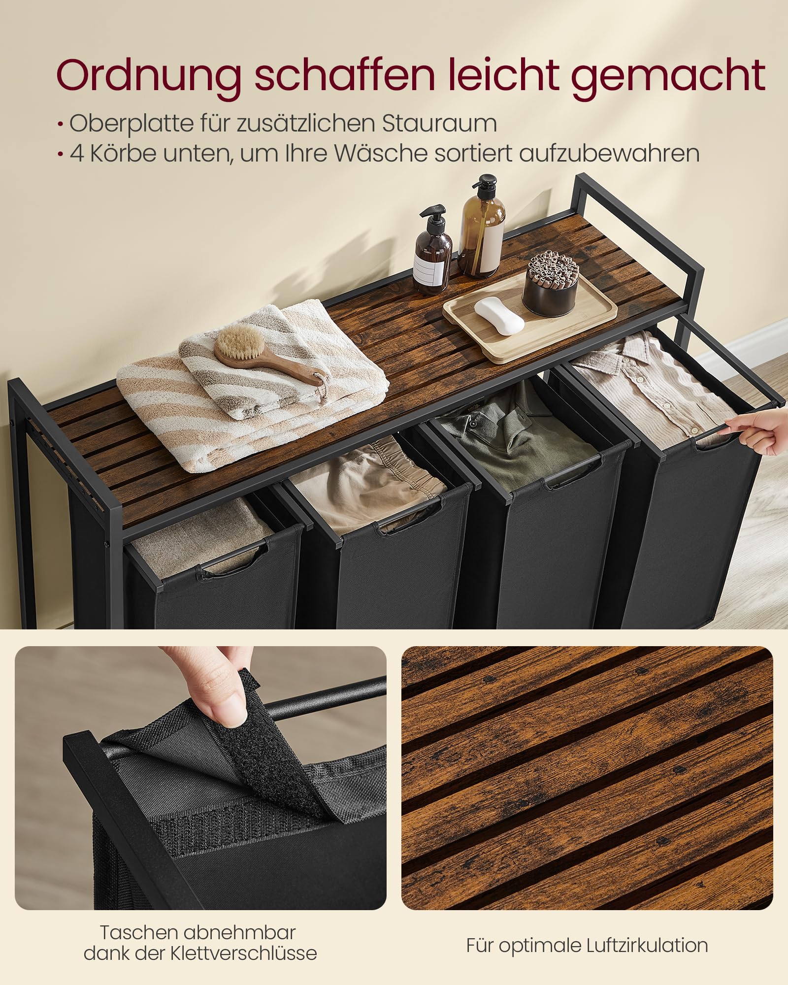 VASAGLE Wäschekorb 4 Fächer BLH401B01, tintenschwarz-vintagebraun