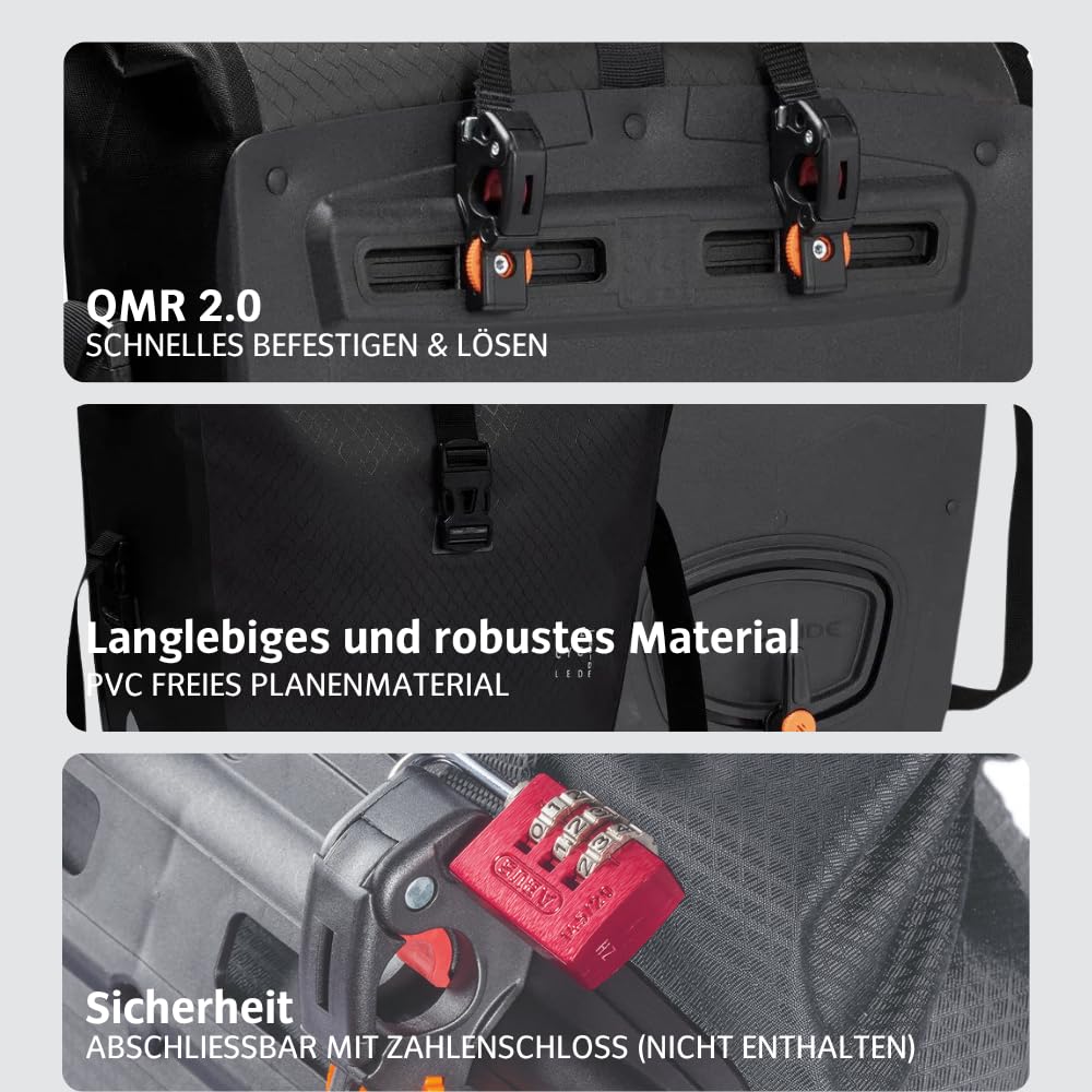 - Unkomplizierte Montage: Das bewährte QMR 2.0 Befestigungssystem passt auf alle runden Gepäckträgerrohre mit einem Durchmesser von 8-16 mm und erlaubt ein kinderleichtes Anbringen und Abnehmen der Taschen.