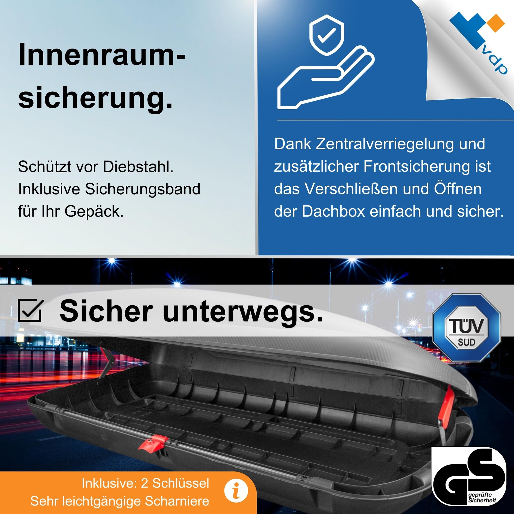 Der Dachkoffer ist so konstruiert, dass er Ihr Gepäck bei normalen Wetterbedingungen wie Regen schützt und wasserabweisend ist. Bei extremen Wetterlagen wie Starkregen oder bei Hochdruckreinigung kann jedoch Feuchtigkeit eindringen.