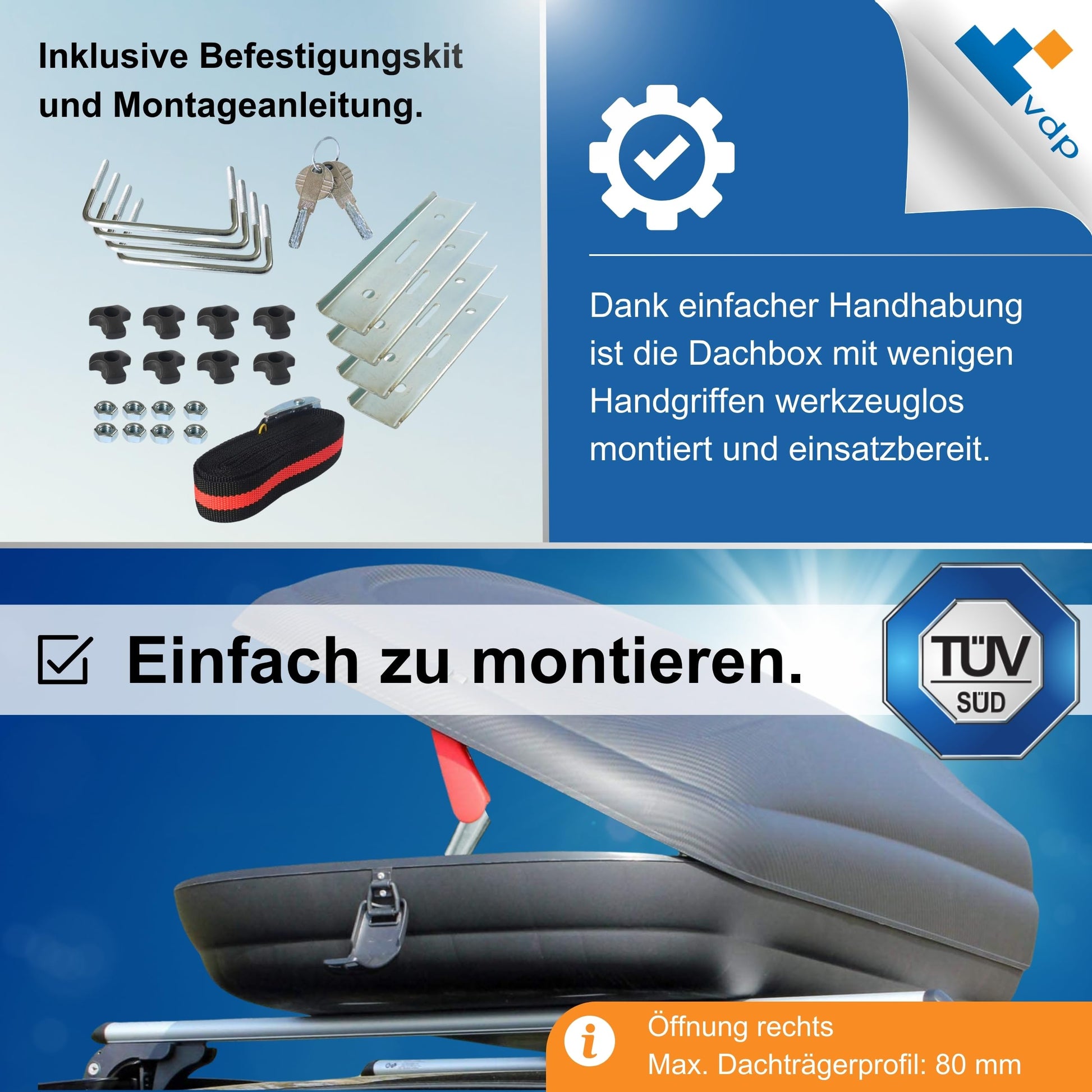 Die Dachbox ist universell passend für die meisten Dachträger mit einem Profil von bis zu 80 mm Breite und 35 mm Höhe. Sie benötigen lediglich einen für Ihr Fahrzeugmodell passenden Grundträger, auf dem die Box mit dem mitgelieferten U-Bügel-System montiert wird.