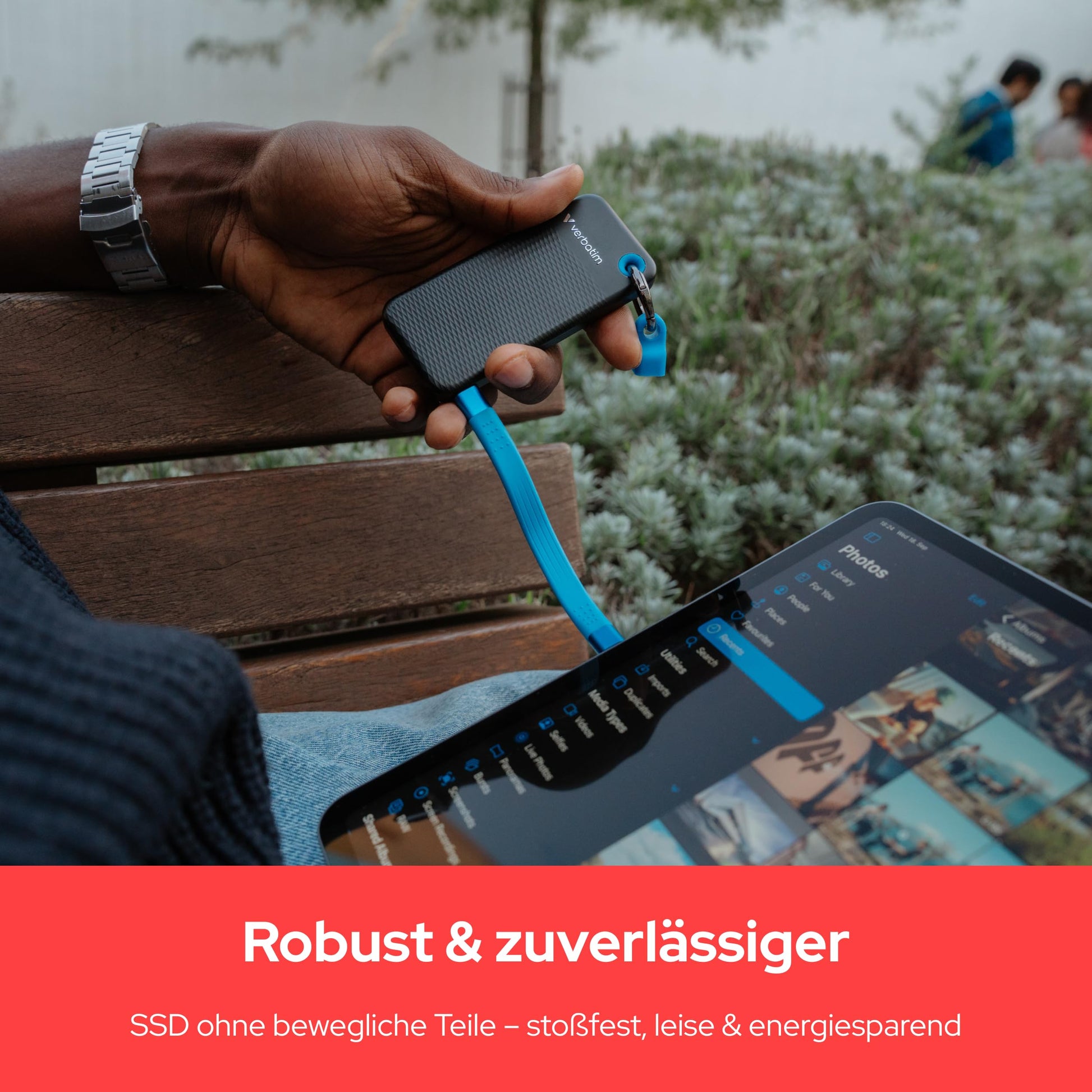 Diese externe SSD ist der perfekte Begleiter für Reisen, mobile Arbeitsplätze oder Gaming-Sessions ausser Haus. Dank des mitgelieferten Schlüsselrings lässt sie sich sicher an einem Rucksack oder einer Gürtelschlaufe befestigen, damit sie nie verloren geht. Die durchdachte Kabelhalterung sorgt dafür, dass das USB-C-Kabel stets ordentlich und ohne Verheddern verstaut ist.