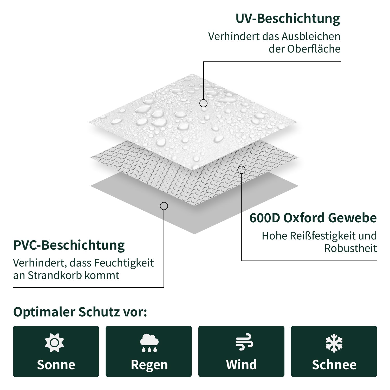 Dank des extrem robusten 600D Oxford-Gewebes mit doppelter Beschichtung ist Ihr Strandkorb perfekt vor Regen, Schnee und starker Sonneneinstrahlung geschützt. Die innere PVC-Beschichtung sorgt dafür, dass Wasser zuverlässig abperlt und Ihr Strandkorb trocken bleibt, während die äussere UV-Schutzschicht die intensive schwarze Farbe der Hülle auch bei dauerhafter Sonneneinstrahlung bewahrt.