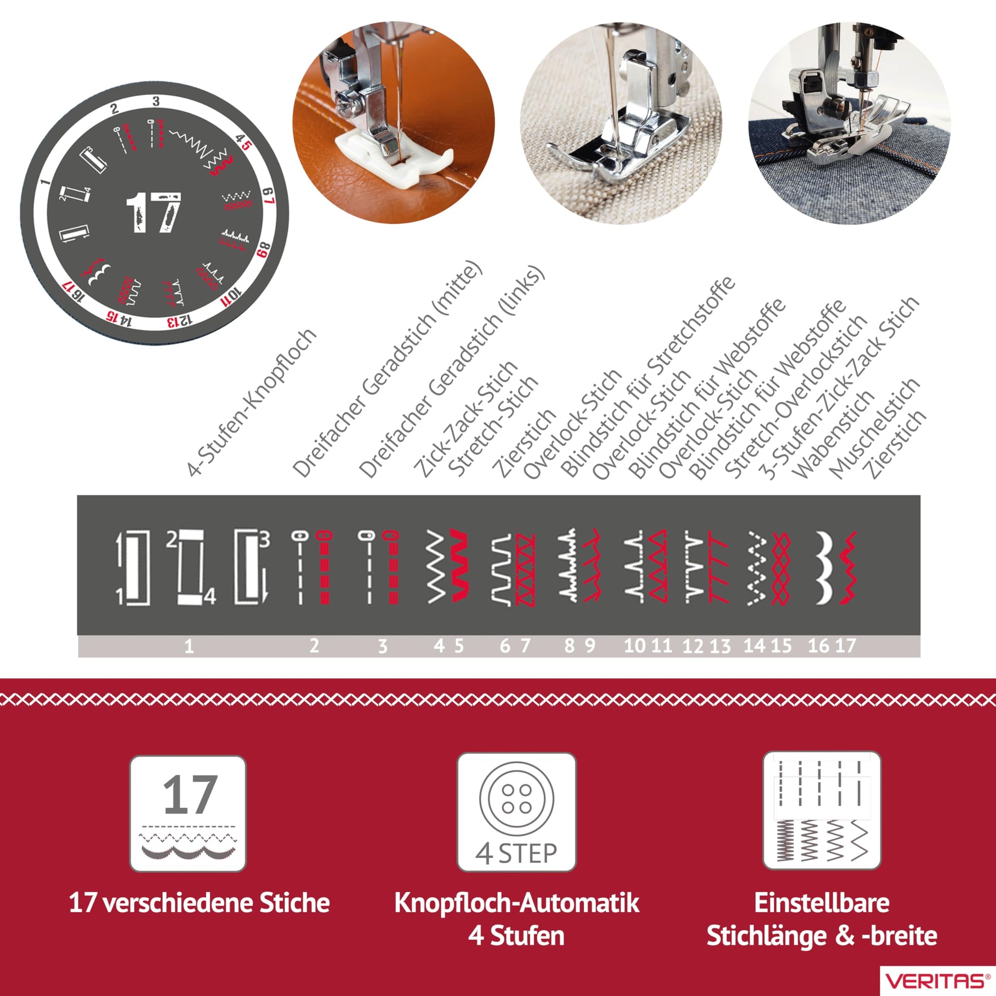 Die VERITAS Power Stitch 17 verfügt über 17 Stichprogramme, darunter Nutz-, Zier-, Stretch- und Overlock-Stiche. Sie können die Stichlänge stufenlos von 0 bis 4 mm und die Stichbreite bei Zick-Zack-Stichen bis 5 mm individuell einstellen.