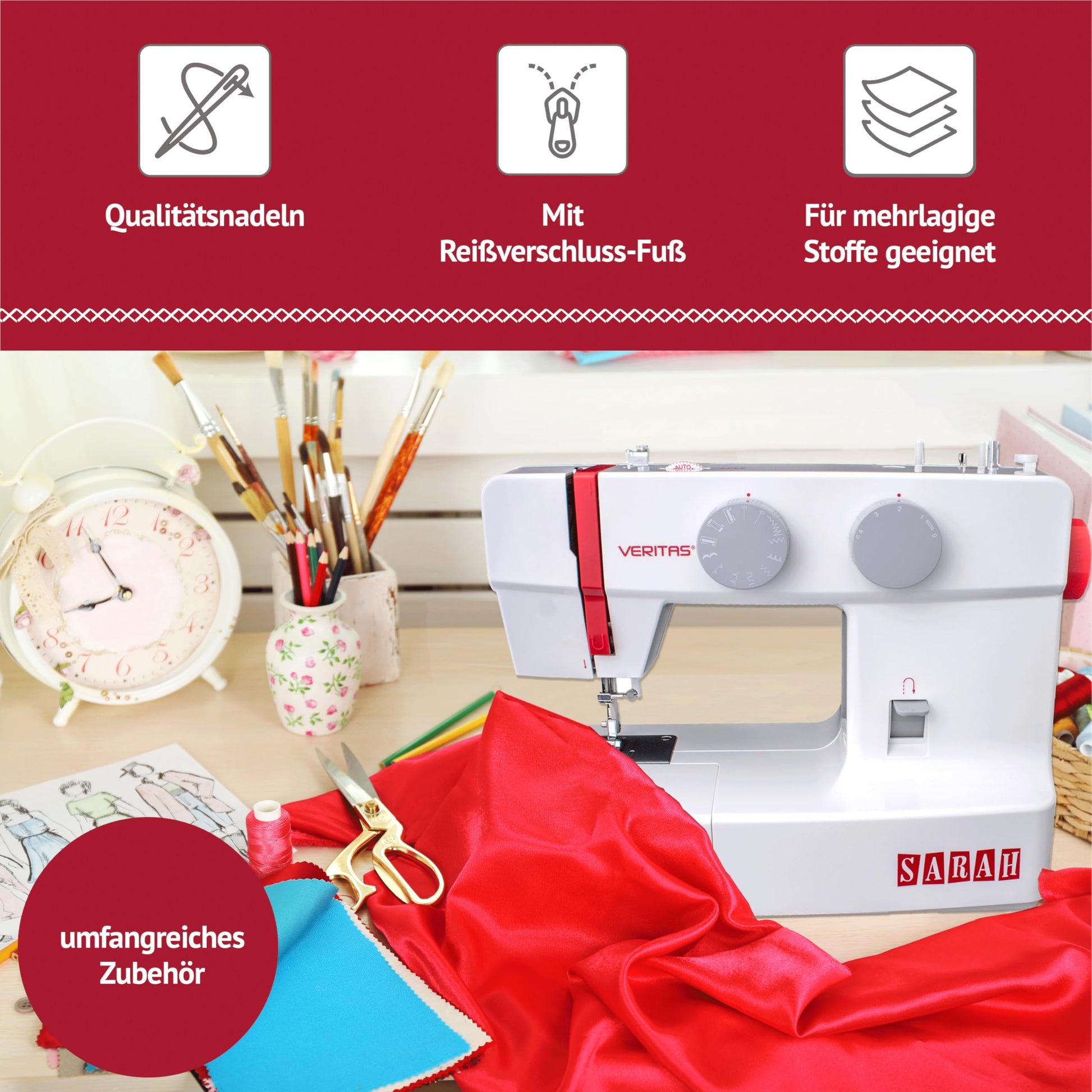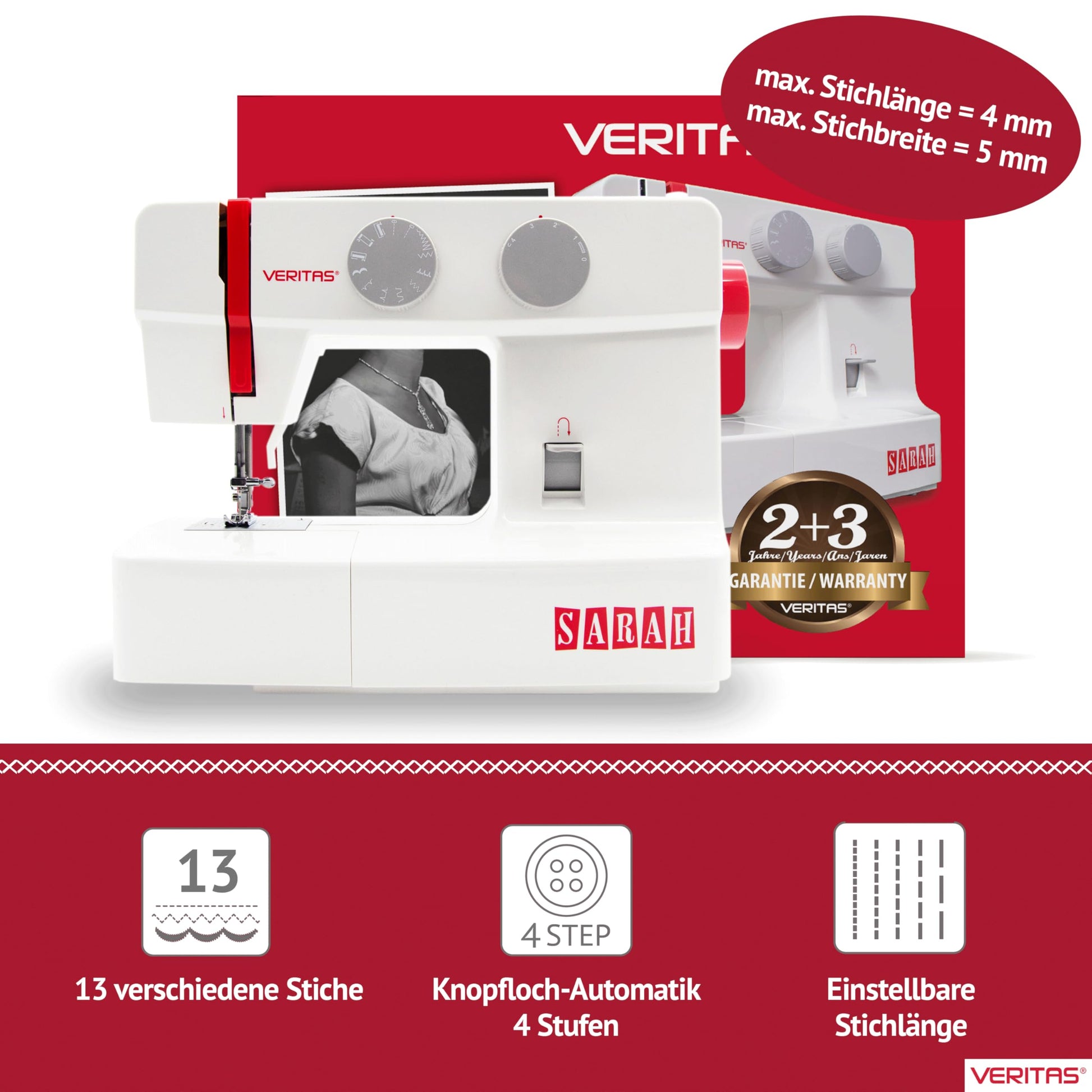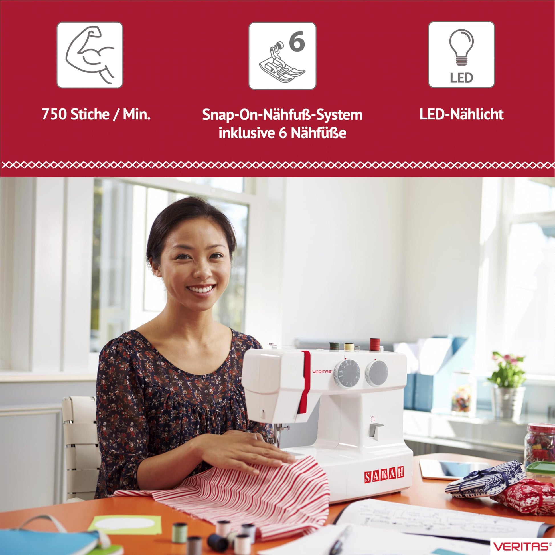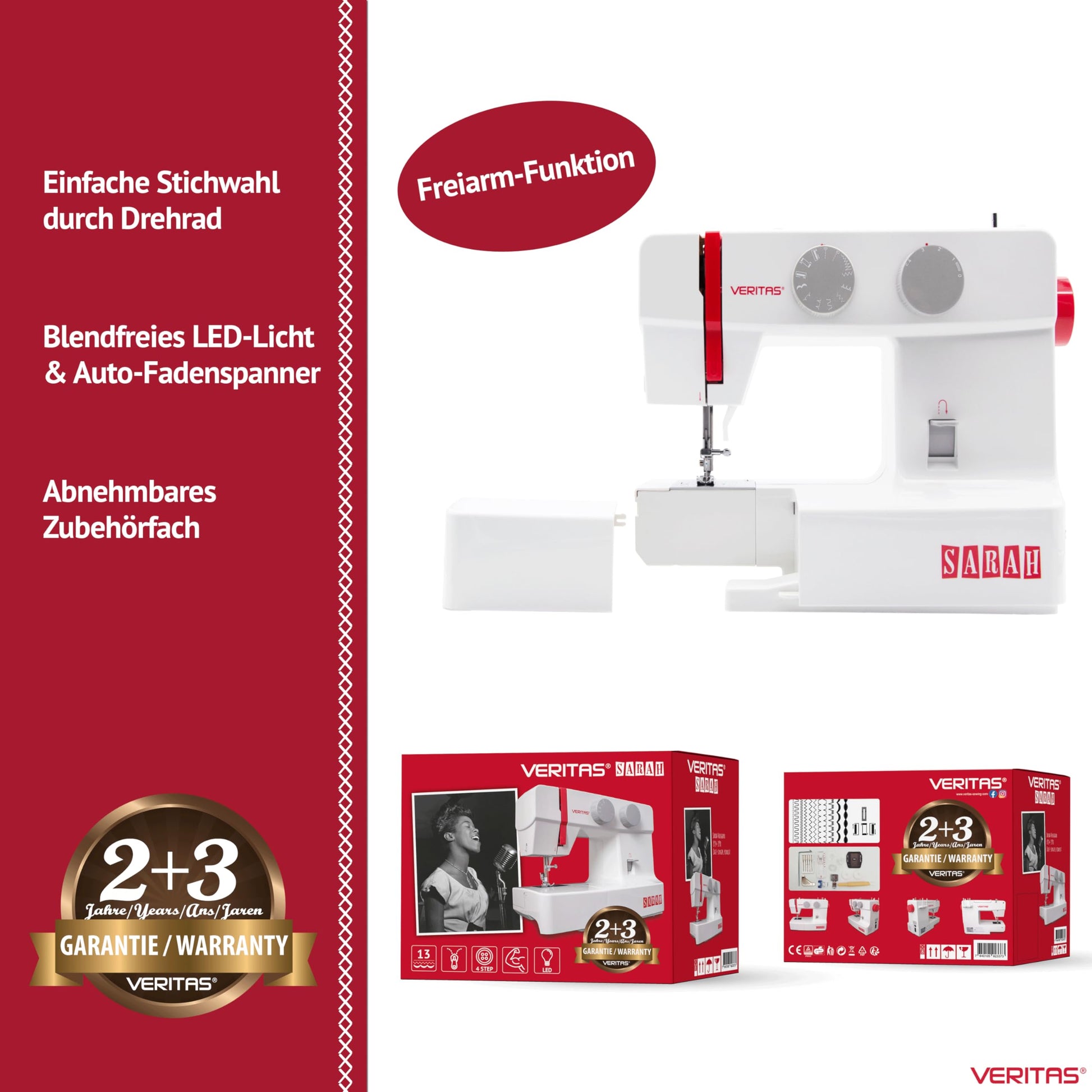 VERITAS Sarah I Freiarm Nähmaschine für Anfänger – Weiss-Rot
