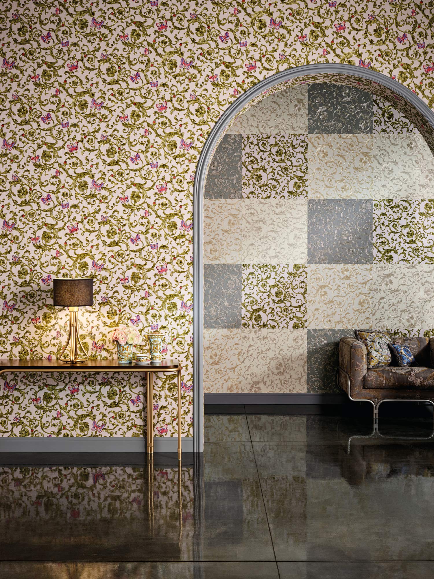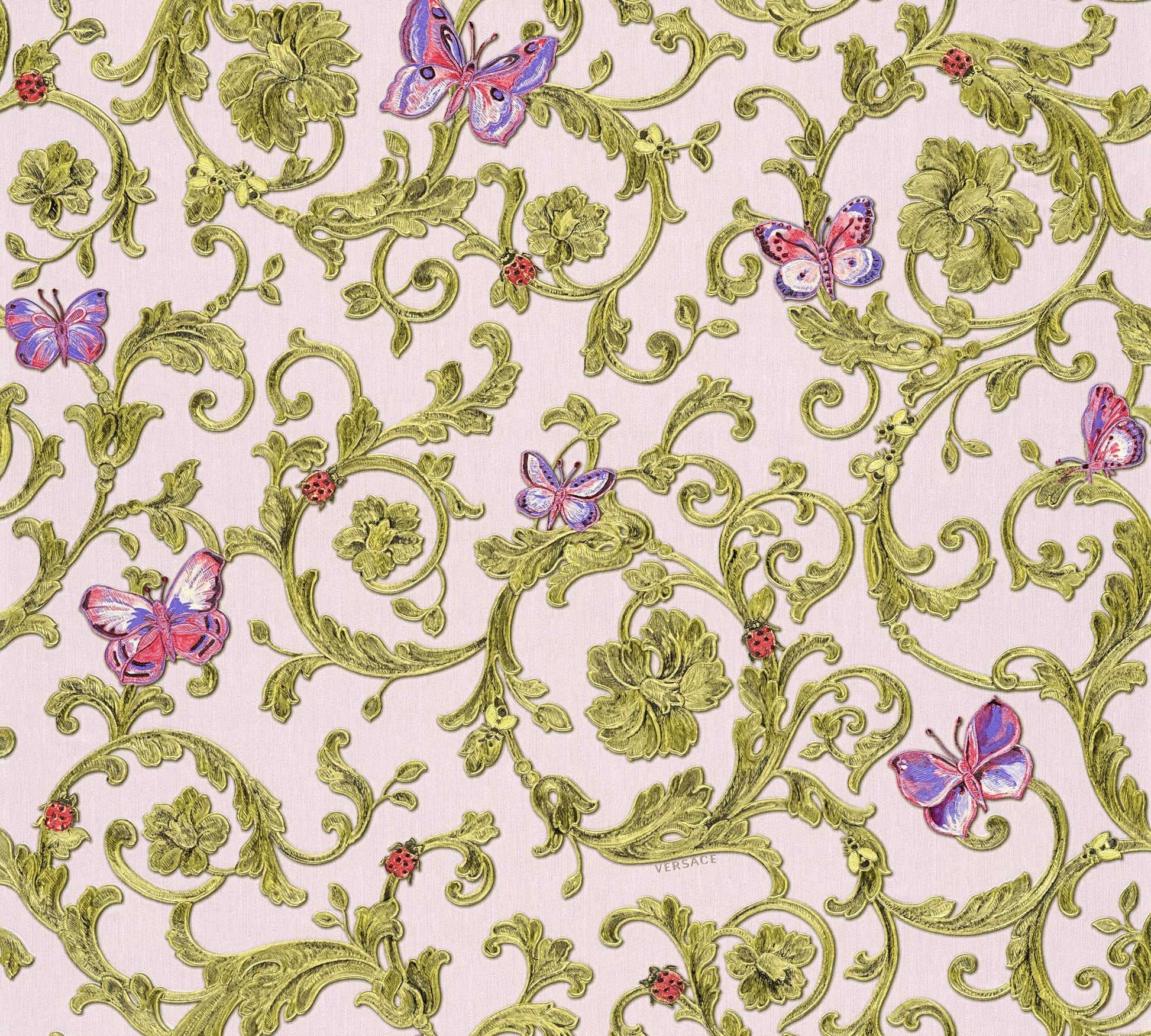Das Design «Butterfly Barocco» ist ein wahres Kunstwerk für Ihre Wände. Farbenprächtige Schmetterlinge und Käfer beleben elegante, barocke Blütenranken und schaffen eine heitere, lebendige Atmosphäre. Die exquisite Farbkomposition aus zartem Rosa, Ocker und Grüngold ergänzt die klassische Versace-Farbpalette und verleiht jedem Raum eine eindrucksvolle und persönliche Note. So werden einst kahle Wände zum absoluten Highlight Ihres Zuhauses.
