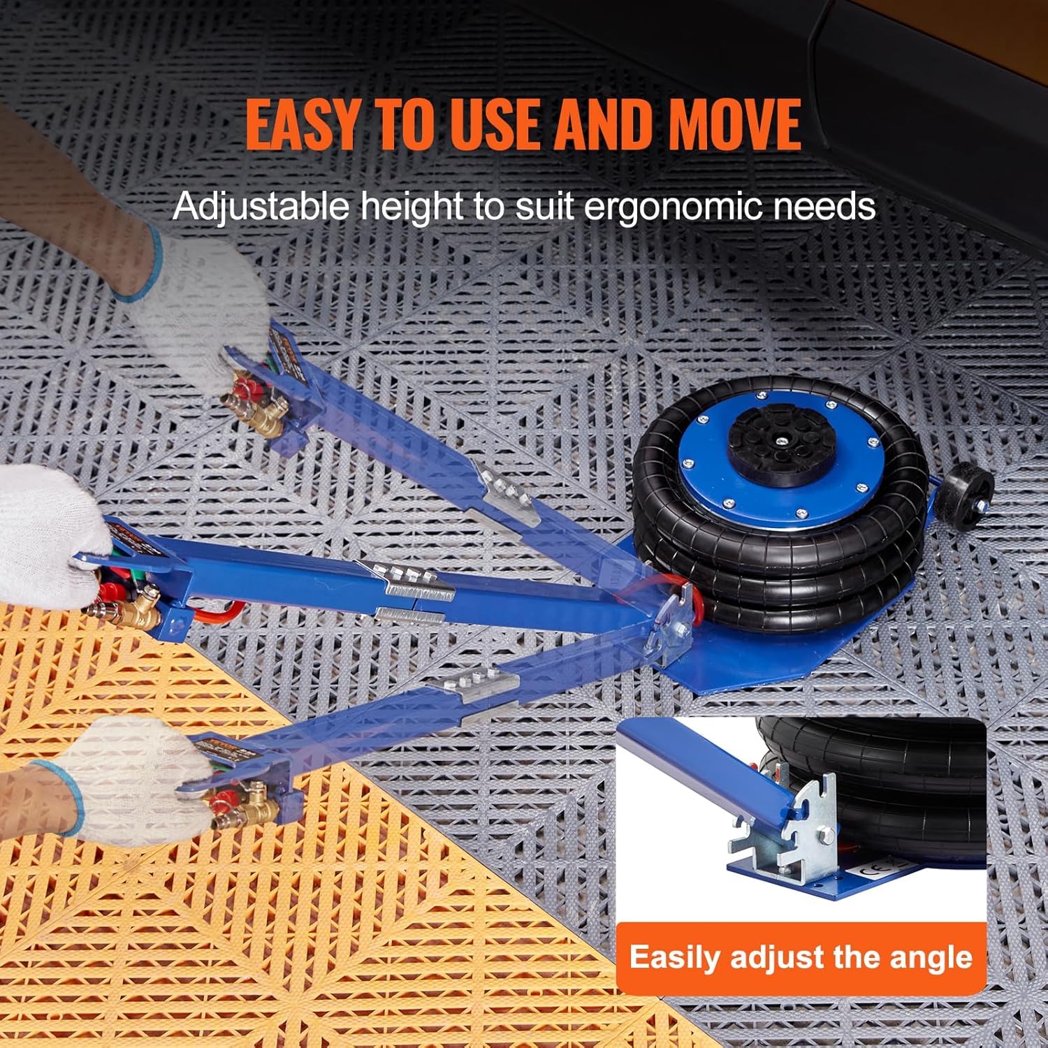 - Einfache und schnelle Bedienung: Dank des langen Griffs und der integrierten Rollen lässt sich der Wagenheber leicht und ergonomisch positionieren. Nach dem Anschluss an einen Luftkompressor ist Ihr Fahrzeug über die praktischen Steuerventile in nur 5 Sekunden angehoben.