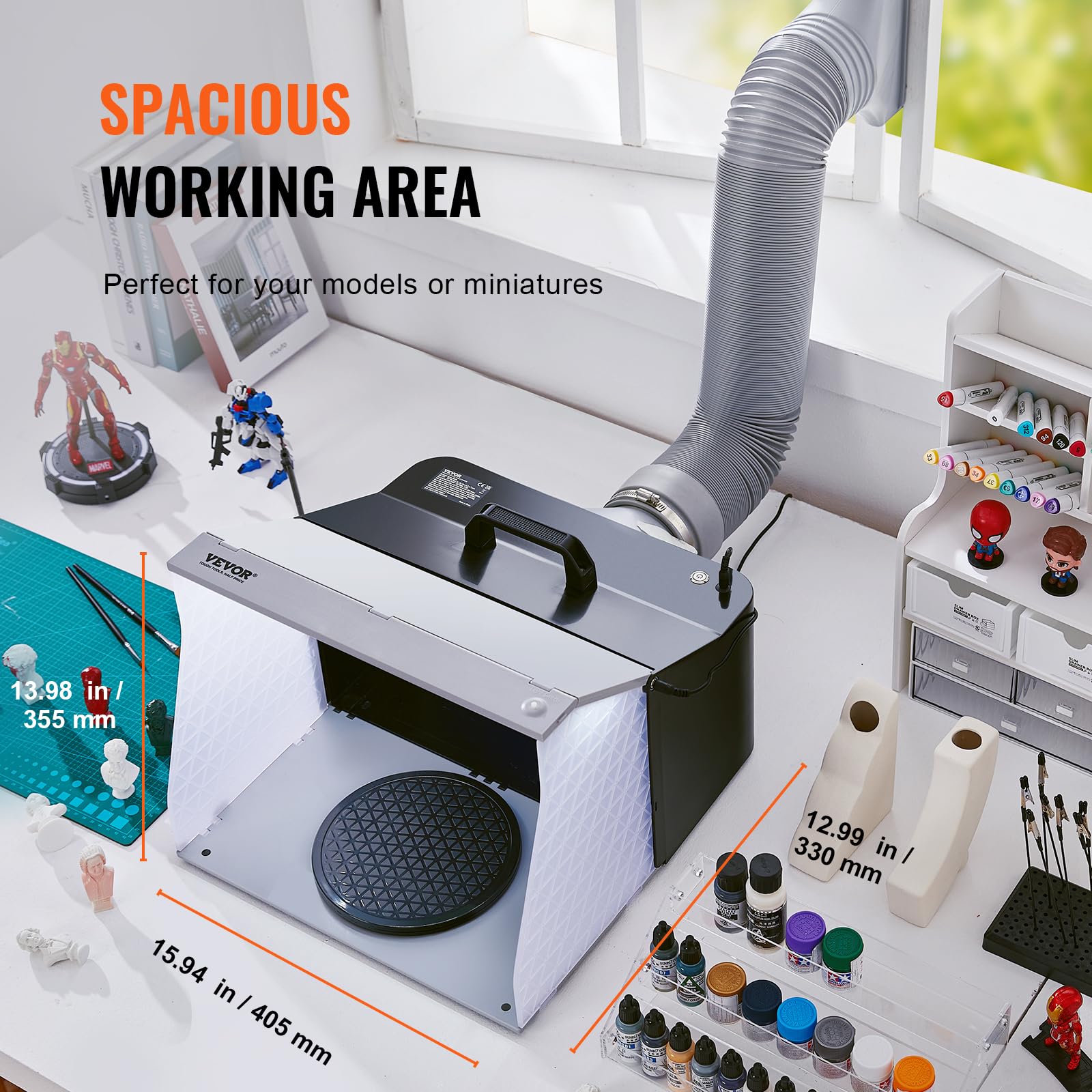 Die VEVOR Airbrush-Spritzkabine ist Ihr idealer Partner für saubere und professionelle Lackierarbeiten. Dieses tragbare System kombiniert eine starke Absaugleistung mit optimaler Beleuchtung, um bei all Ihren Projekten für makellose Ergebnisse zu sorgen.