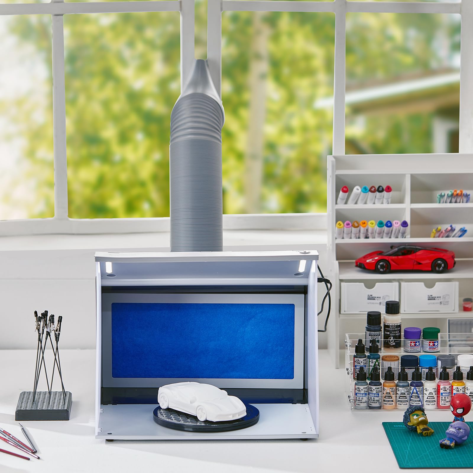 Diese vielseitige Kabine ist ideal für Modellbau, das Verzieren von Kuchen, das Lackieren von Kleinteilen, Spielzeug oder Keramik. Sie verbessert Ihre Ergebnisse, indem die starke Absaugung mit zwei Ventilatoren Farbnebel und Staubpartikel entfernt, was Ablagerungen auf Ihrem Projekt verhindert. Die helle LED-Beleuchtung und der 360°-Drehteller sorgen zusätzlich für ein makelloses, gleichmässiges Finish.