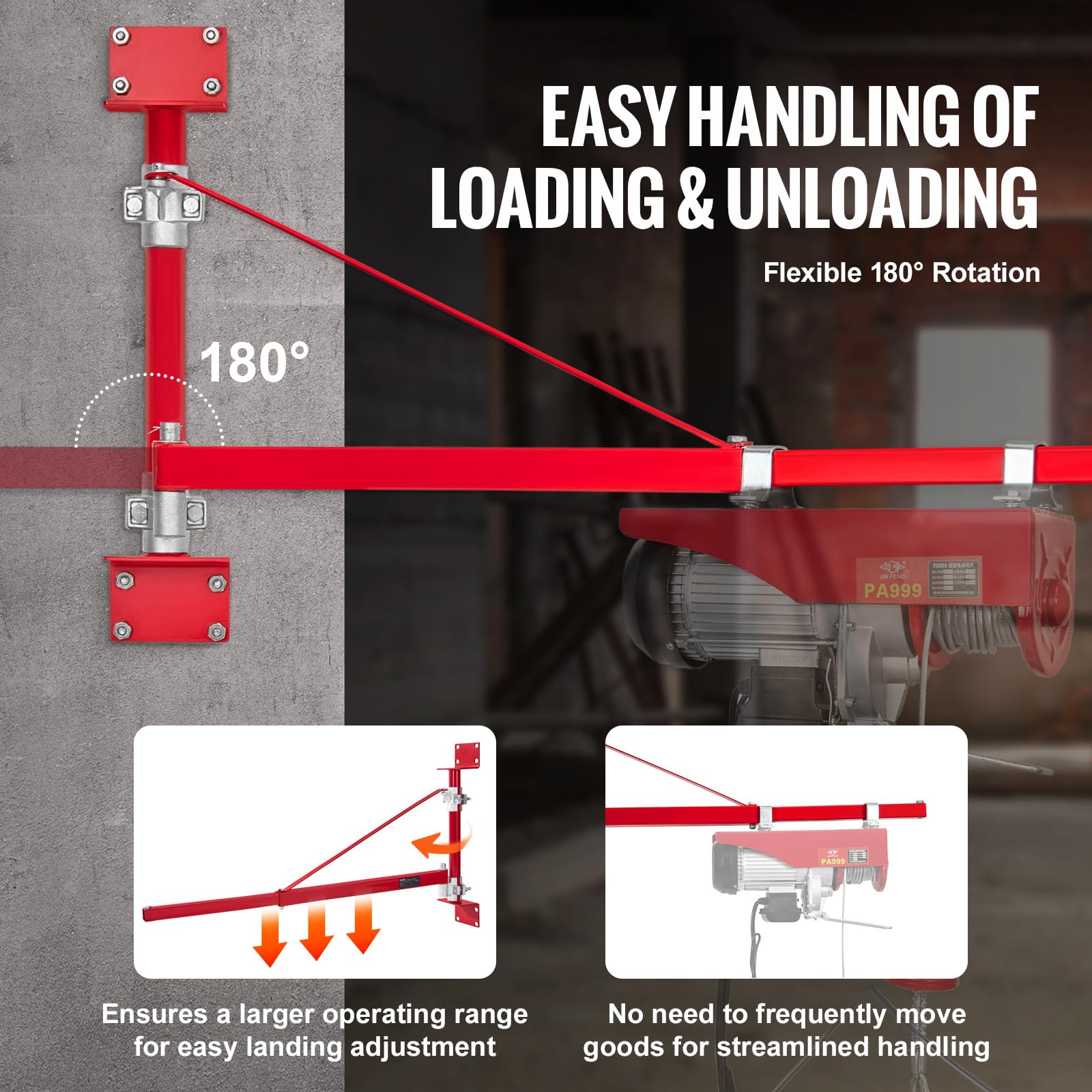 - Maximale Flexibilität durch 180°-Schwenkarm: Der grosse Schwenkbereich von 180 Grad erweitert Ihren Aktionsradius erheblich. Erledigen Sie Hebeaufgaben effizienter, ohne das Gerät ständig neu positionieren zu müssen.